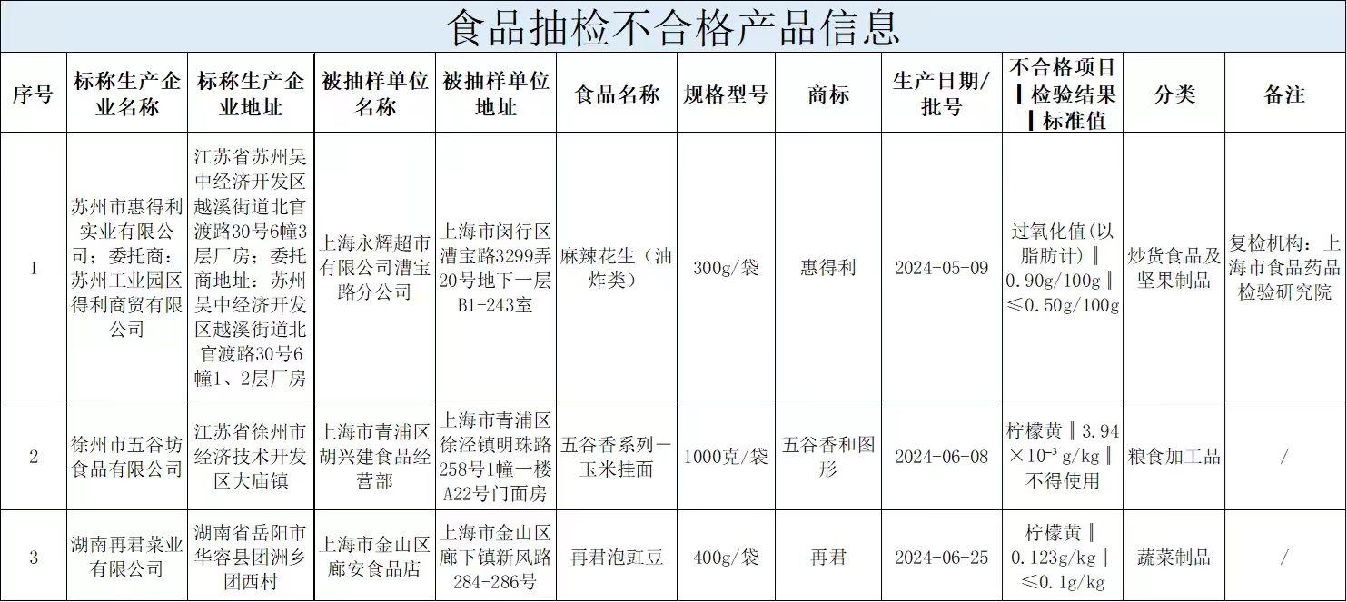 标称由“苏州市惠得利实业有限公司;委托商:苏州工业园区得利商贸有限公司”生产,被抽样单位为上海永辉超市有限公司漕宝路分公司,不合格产品为“惠得利”麻辣花生(油炸类)。不合格项目为过氧化值(以脂肪计)超标。过氧化值主要反映食品中油脂是否氧化变质。一般不会对人体的健康产生损害,但严重时会导致肠胃不适、腹泻等症状。过氧化值超标的原因,可能是产品用油已经变质,或者产品在储存过程中环境条件控制不当;也可能是原料中的脂肪已经氧化,原料储存不当。