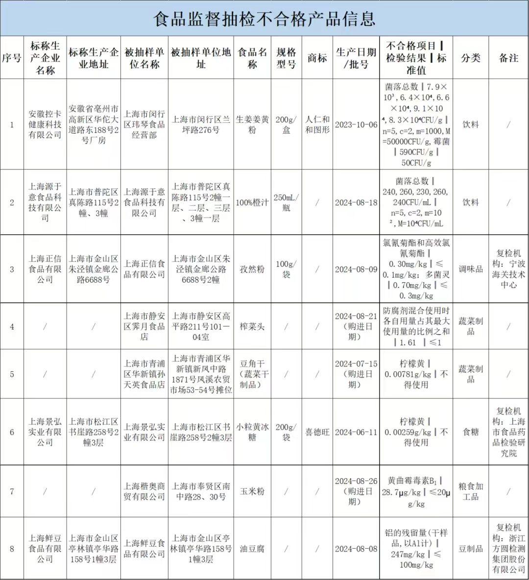 标称由安徽控卡健康科技有限公司生产、被抽检单位为上海市闵行区玮琴食品经营部,不合格食品名称为“生姜姜黄”,菌落总数、霉菌等不合格。以及标称由上海源于意食品科技有限公司生产、被抽检单位为上海源于意食品科技有限公司,不合格食品系一款橙汁,菌落总数不合格。