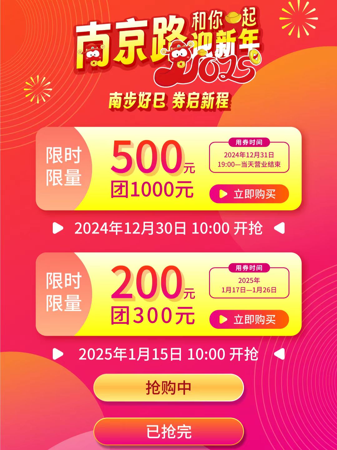 2024年12月25日上午10:00,首波促销优惠券如约回归。主办方将在“南京路步行街”支付宝小程序上,发放15000张550元团购800元促销优惠券以及10000张200元团购300元促销优惠券。使用时间为2024年12月27日—2025年1月5日。