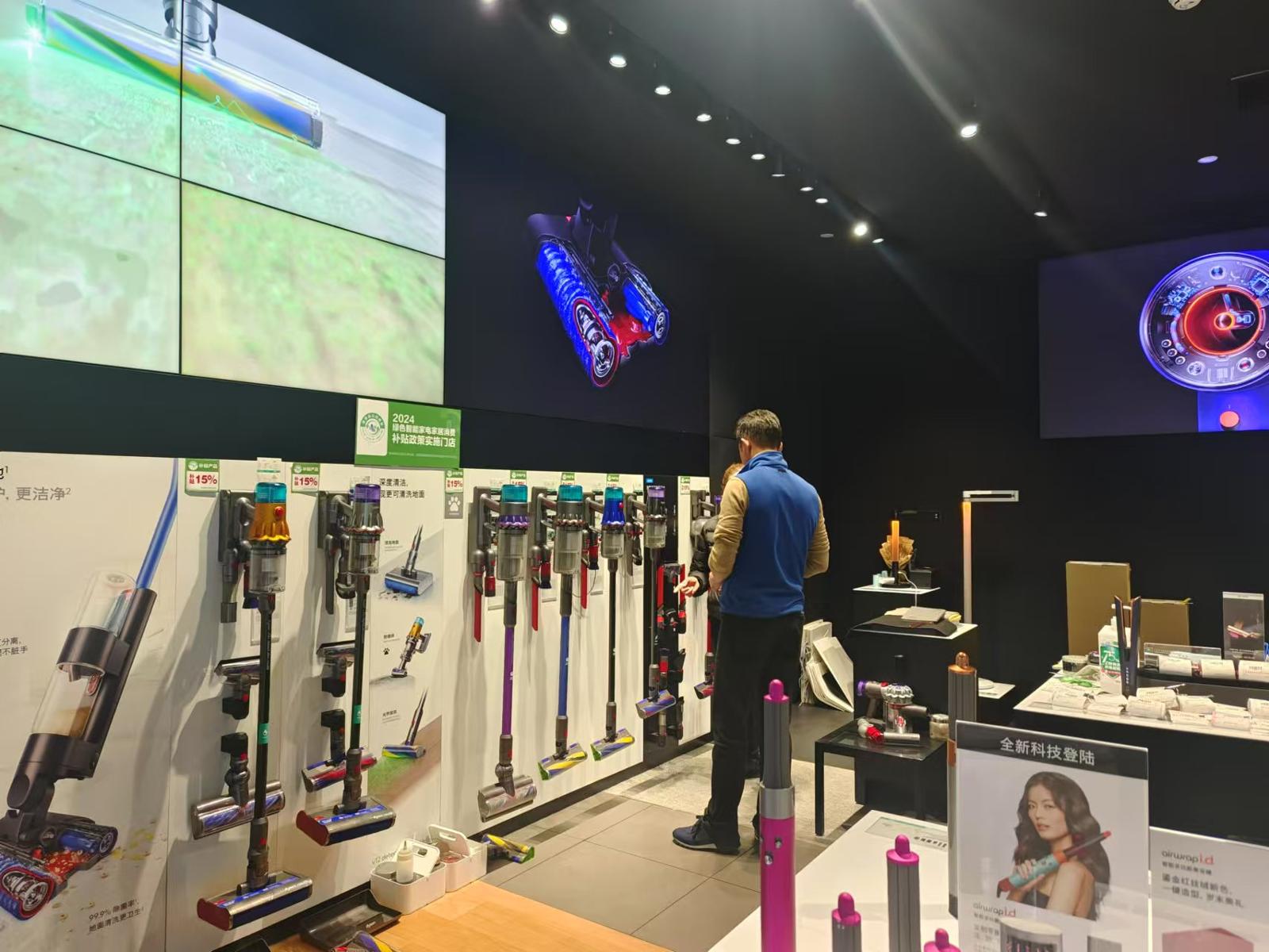 12月31日也是家电“以旧换新”补贴的最后一天,在戴森专柜,吸引了相当一部分消费者前来选购吸尘器、冷热风扇、吹风机等家电商品。工作人员向劳动报记者举例,以一款最新款的戴森吸尘器为例,原价为4899元,年末活动价为4099元,在4099元的价格基础上可以享受商场“满2000元送300元券”的活动,并可以赶上“以旧换新”的“末班车”,享受15%的政府补贴,最终实付金额为3484元左右、并赠送600元消费券,消费券可在商场全场通用。