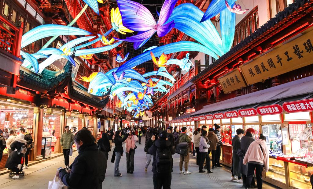 2025年春节,是“春节——中国人庆祝传统新年的社会实践”成功列入联合国教科文组织人类非物质文化遗产代表作名录后的首个春节。1月10日至1月12日,豫园商城变身为沉浸式新春非遗大集市,游客们不仅可以畅游流光溢彩的豫园灯会,还能徜徉于琳琅满目的节日集市,领略非遗的独特魅力。