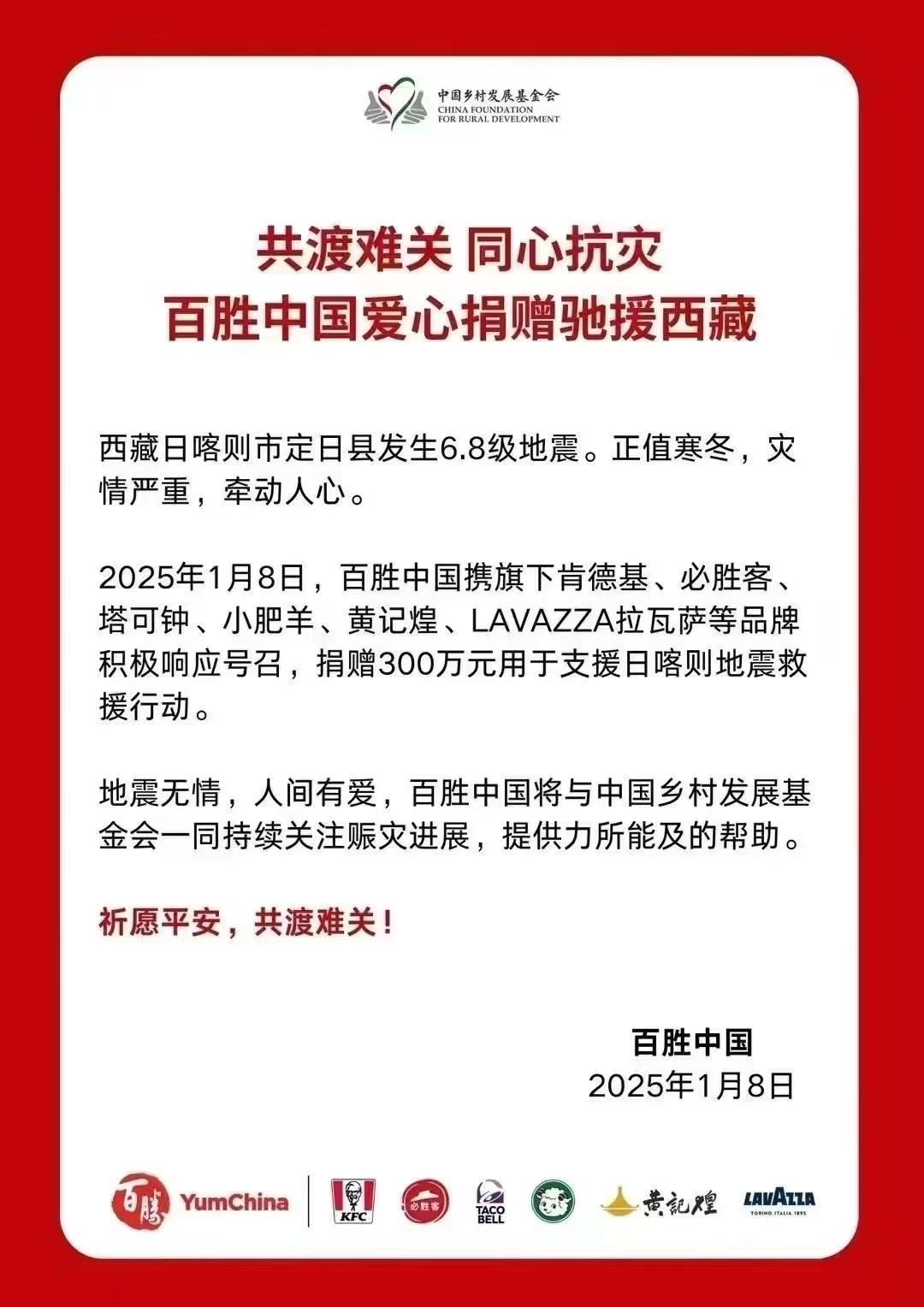 百胜中国方面表示,百胜中国携旗下肯德基、必胜客、塔可钟、小肥羊、黄记煌、LAVAZZA拉瓦萨等品牌积极响应号召,捐赠300万元用于支援日喀则地震救援行动。地震无情,人间有爱,百胜中国将与中国乡村发展基金会一同持续关注赈灾进展,提供力所能及的帮助。祈愿平安,共渡难关!