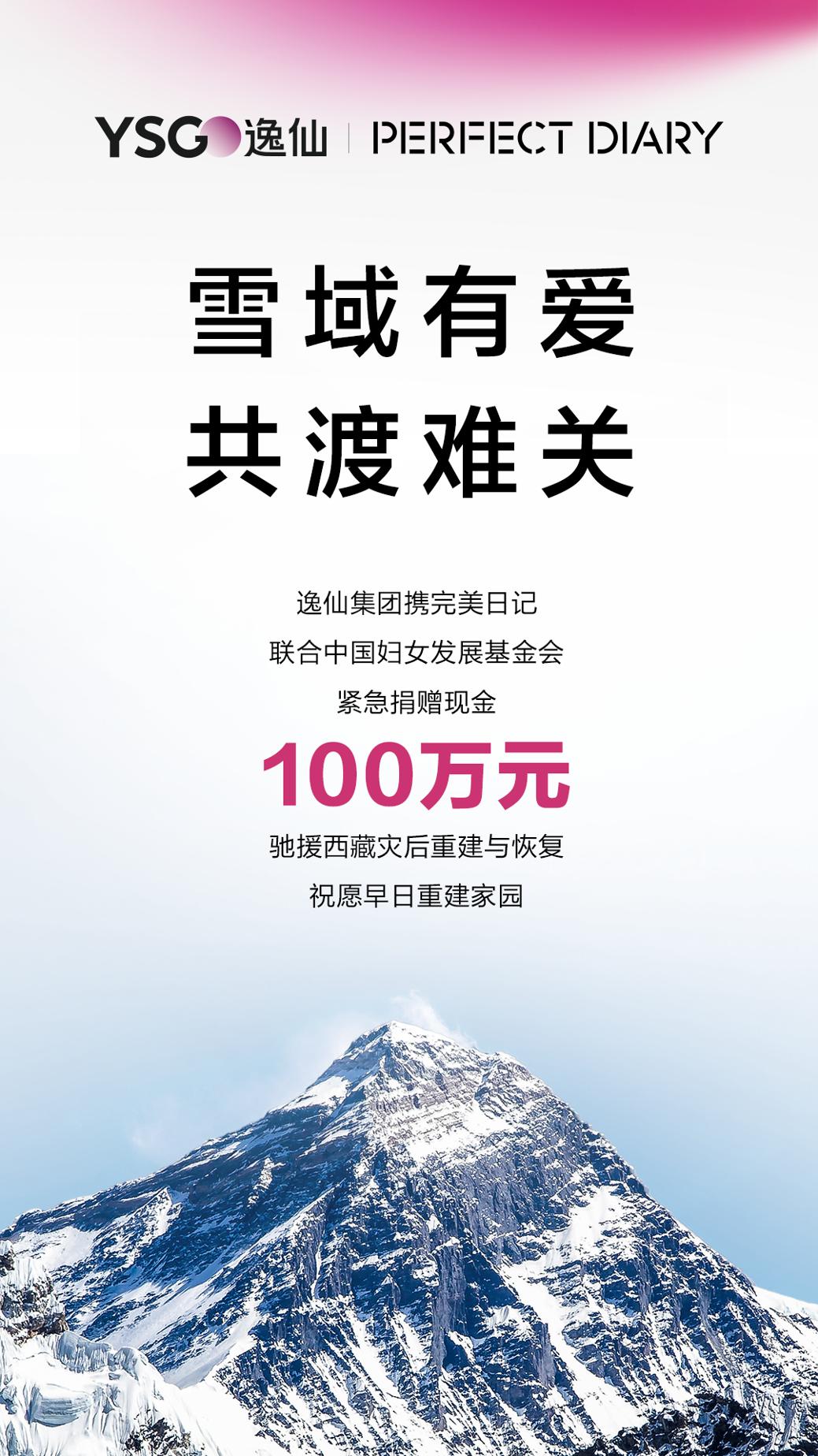 地震灾情牵动着全国人民的心。逸仙集团迅速响应,携旗下品牌完美日记,联合中国妇女发展基金会向西藏受灾地区捐赠100万元人民币,驰援灾后重建与恢复。雪域有爱,共渡难关。逸仙集团表示,将密切关注灾情救援进展,为灾区同胞们提供力所能及的帮助,祈愿平安!