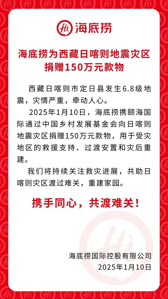 海底捞携颐海国际通过中国乡村发展基金会向日喀则地震灾区捐赠150万元款物,用于受灾地区的救援支持、过渡安置和灾后重建。海底捞表示,将持续关注救灾进展,共助日喀则灾区渡过难关,重建家园。