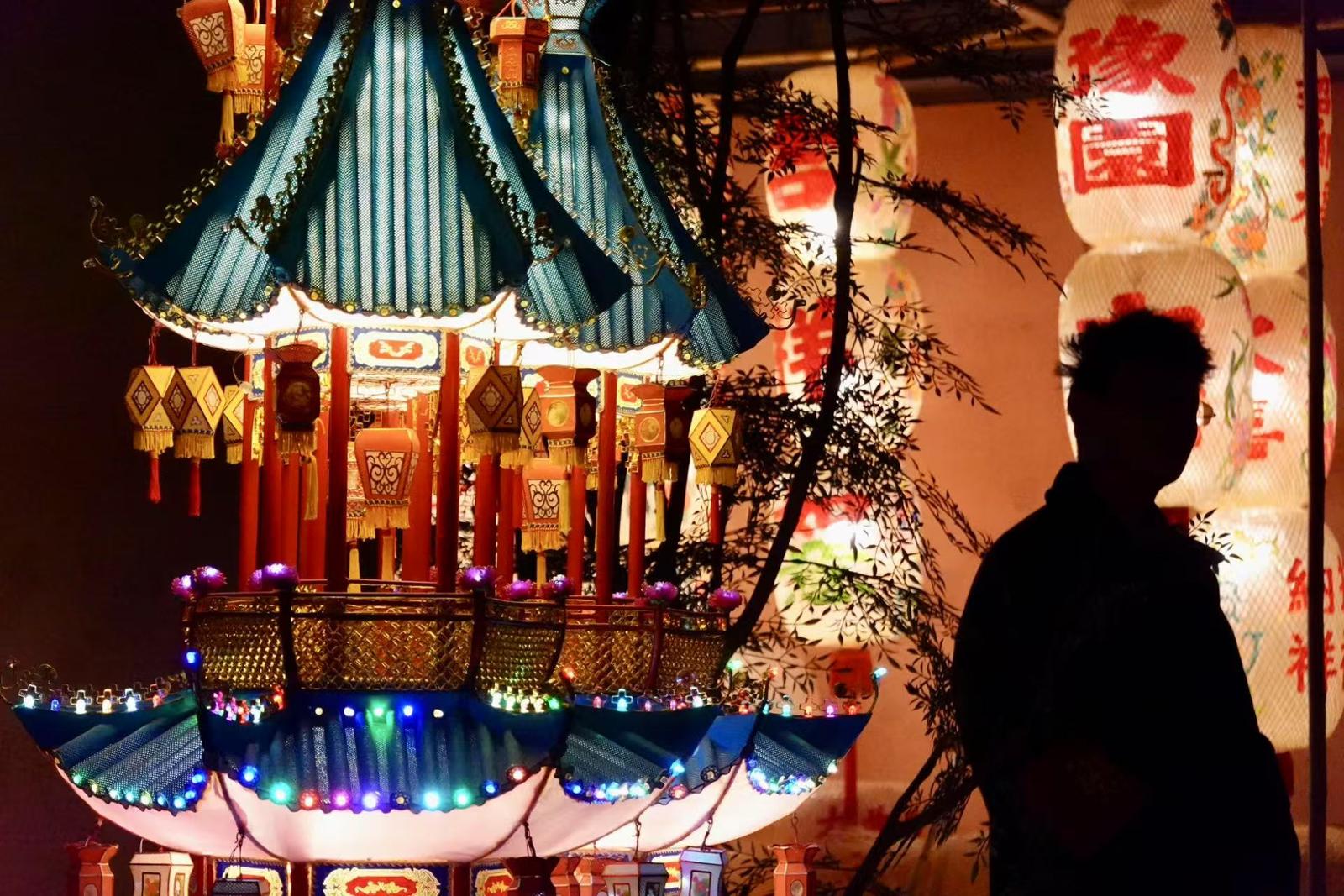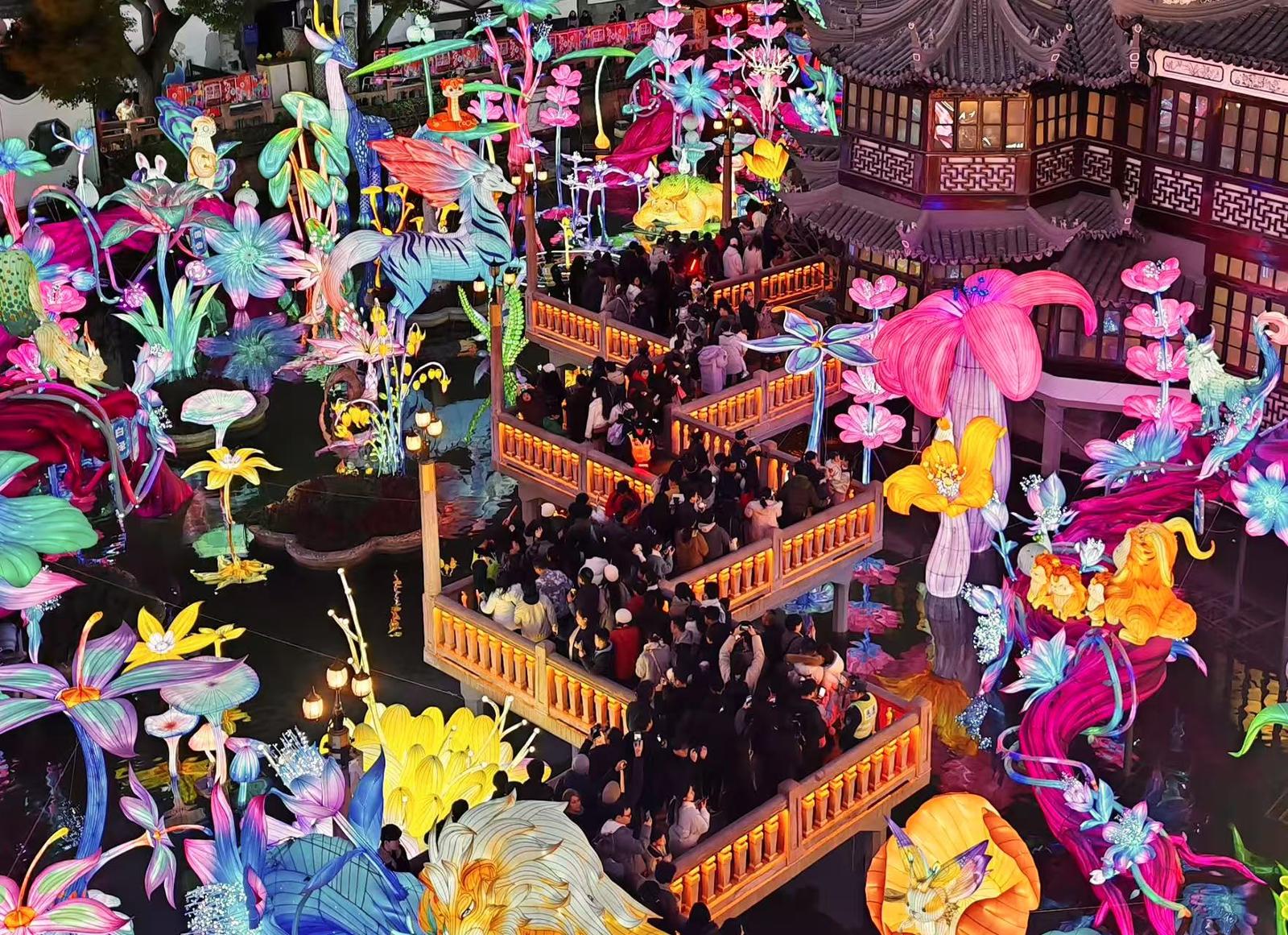 豫园九曲桥,被各式花灯打造成弥漫青草香和花香的“丛林”。贡俊祺摄