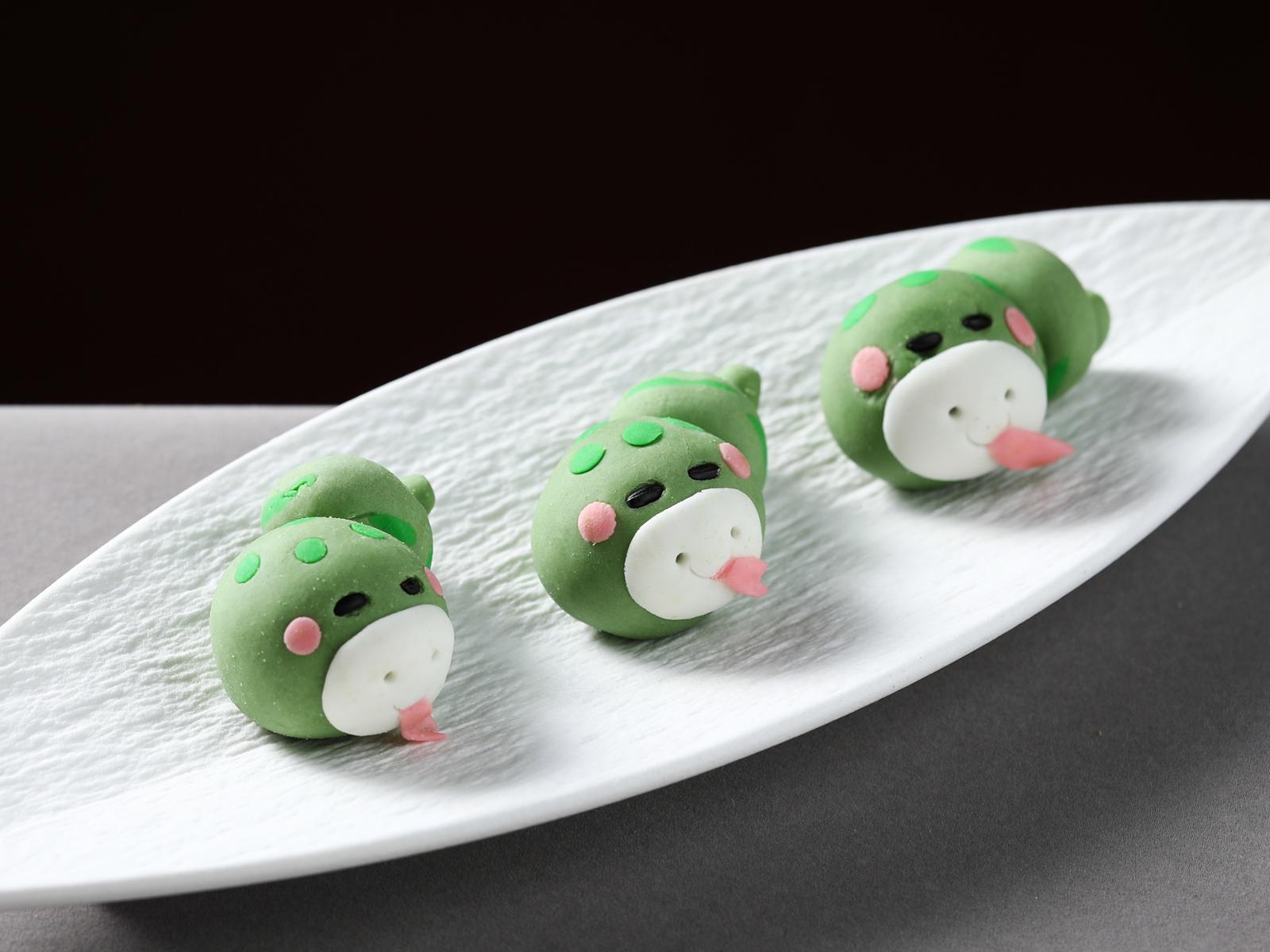 “和汤团一样以糯米为主材,莲蓉馅,但该点心上锅蒸制而不是用水煮,因此在制作时糯米团子会偏硬一些更好定型。”徐正留介绍,“蛇来运转”的青蛇蛇身是用菠菜汁和抹茶粉调制色彩,红色为火龙果汁调制,脸庞的白色部分为糯米。“制作过程比较复杂,因此每日限量。完成后上锅蒸熟,打开一看,就是栩栩如生、十分可爱的小蛇一枚。除了‘蛇来运转’送祝福,还有小小‘金元宝’点心,给蛇年新春讨个‘富贵吉祥’的好彩头。”