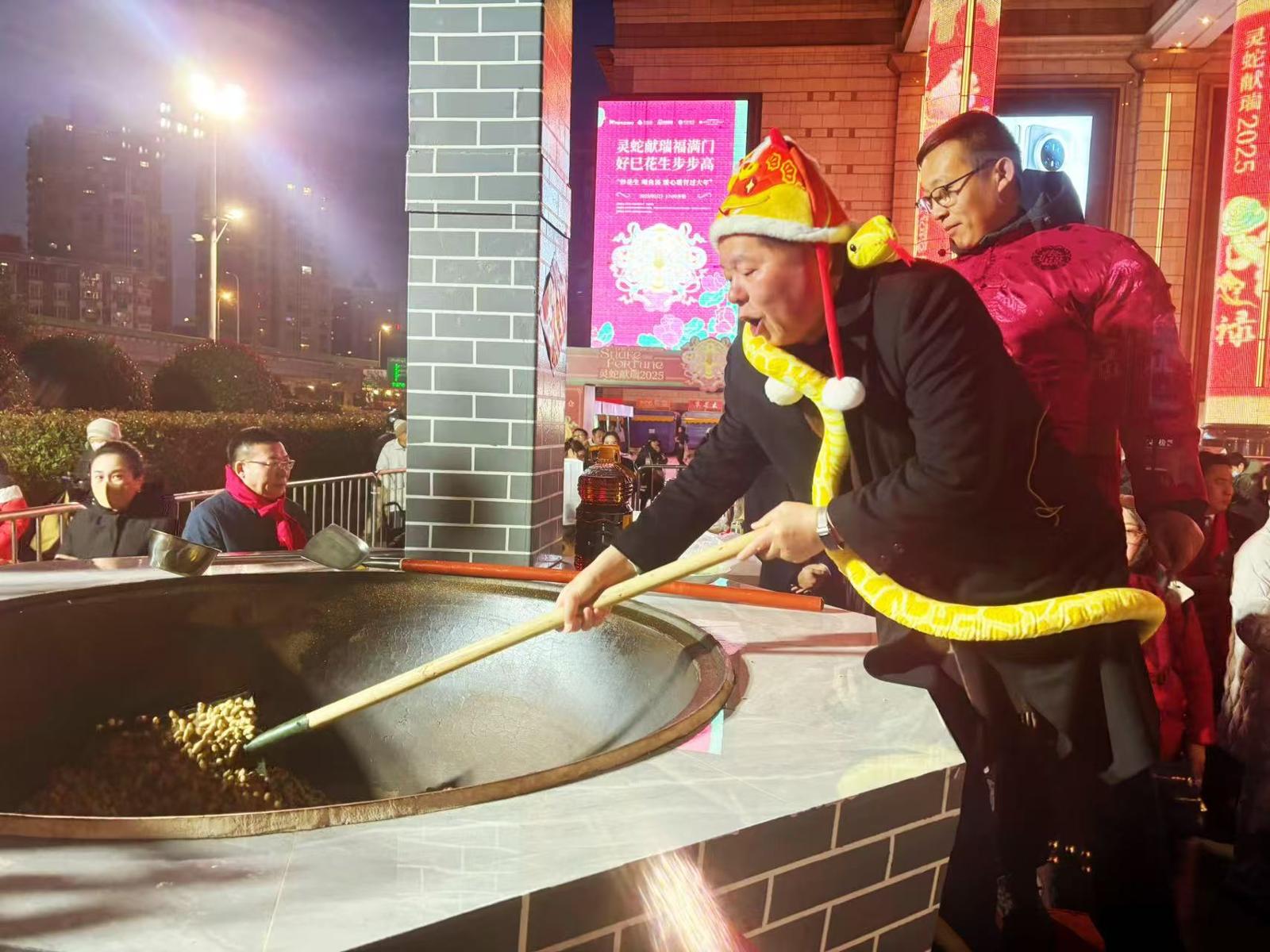 1月27日小年夜傍晚,浦西大型商业综合体环球港开启“灵蛇献瑞福满门 好巳花生步步高”的小年夜民俗活动。现场炒花生、炸春卷、蒸年糕、烤全牛、喝鱼汤......共同庆祝小年夜的团圆时光。