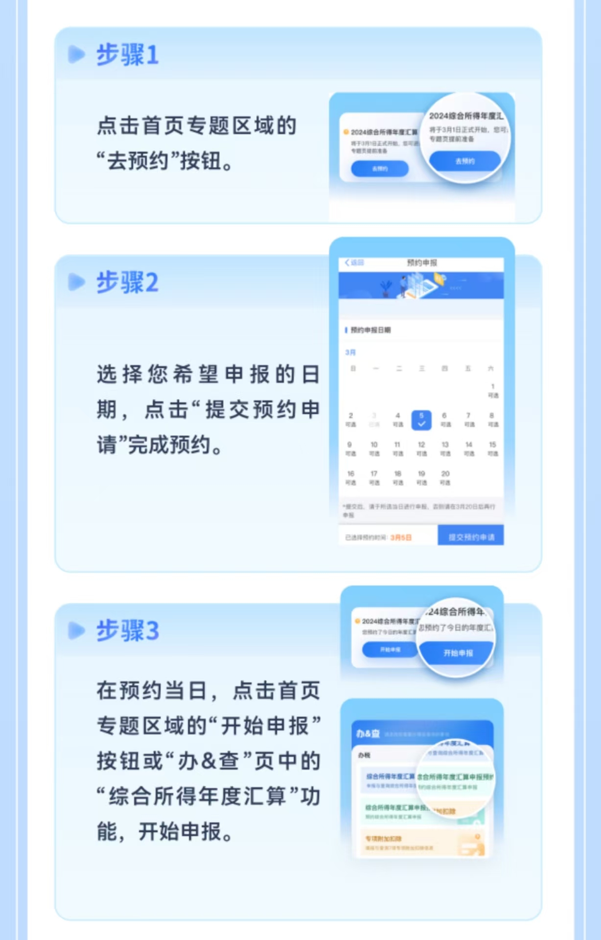 今年仅需“三步”就能在手机上完成2024年度个税汇算预约及申报。首先,打开个税APP,点击首页专题区域的“去预约”按钮,或页面下方“办&查”按钮,在“办税”栏目找到“综合所得年度汇算申报预约”,即可进入预约界面。随后,选择自己想要办理业务的时间,点击“提交预约申请”,就完成了预约。最后,在预约当日,点击首页的“开始申报”,核实了自己的收入信息和专项附加扣除信息后,即可完成个税汇算,并按照提醒办理退税或补税。