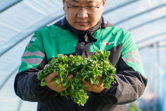 头图:叮咚买菜春菜基地里,江利川手捧刚采摘的春菜。叮咚买菜供图
