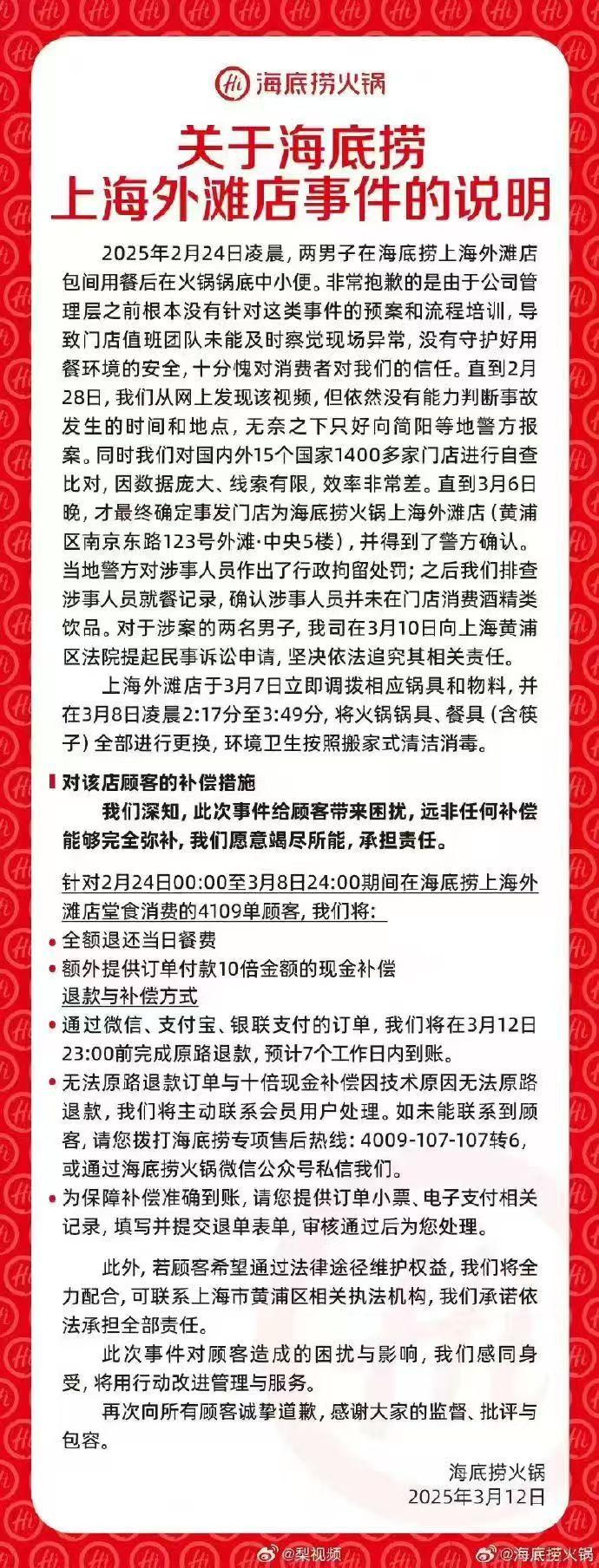 不久前,两名男子在海底捞上海外滩店包间用餐后在火锅锅底中小便,引发舆论风波。3月12日,海底捞发布最新声明称,针对2月24日00:00至3月8日24:00期间在海底捞上海外滩店堂食消费的4109单顾客,将全额退还当日餐费,并额外提供订单付款10倍金额的现金补偿。此外,对于涉案的两名男子,海底捞已在3月10日向上海黄浦区法院提起民事诉讼申请,坚决依法追究其相关责任。