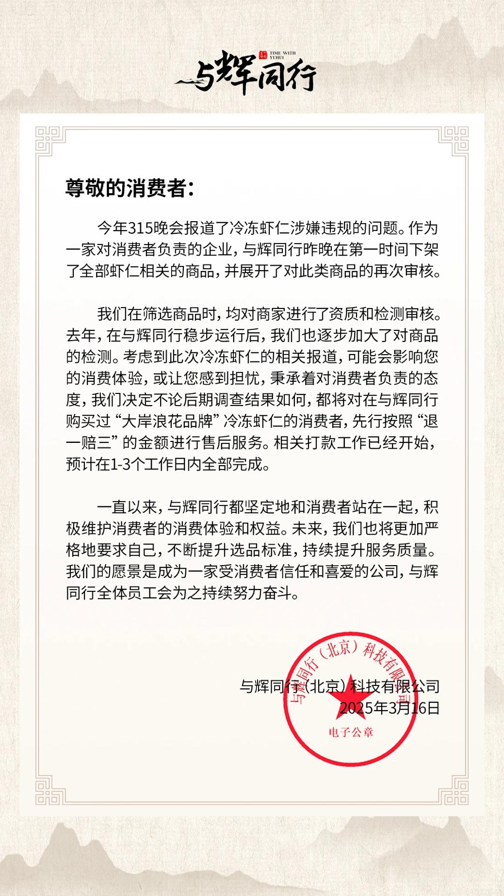 声明中表示其在筛选商品时,均对商家进行了资质和检测审核。去年,在“与辉同行”稳步运行后也逐步加大了对商品的检测。考虑到此次冷冻虾仁的相关报道,秉承着对消费者负责的态度,决定不论后期调查结果如何,都将对在与辉同行购买过“大岸浪花品牌”冷冻虾仁的消费者,先行按照“退一赔三”的金额进行售后服务。相关打款工作已经开始,预计在1-3个工作日内全部完成。