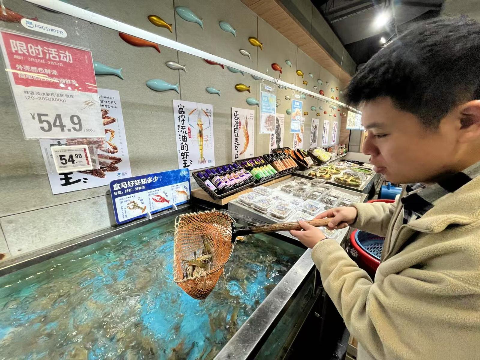 头图:正在商超内挑选鲜活优质的罗氏沼虾。劳动报记者贡俊祺 摄影