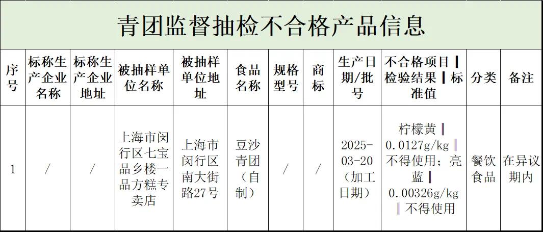 青团监督抽检不合格产品信息。上海市市场监管局图