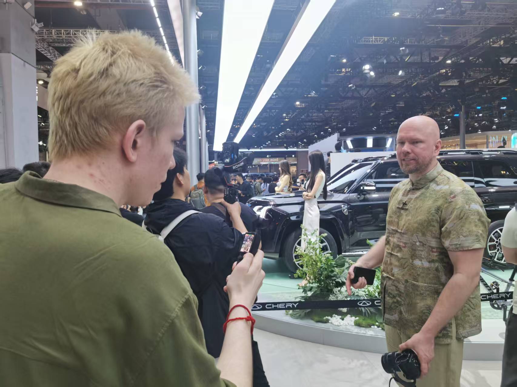 图为正在俄罗斯参观者正在瑞虎9L展台前拍摄视频。劳动报记者 罗菁摄影