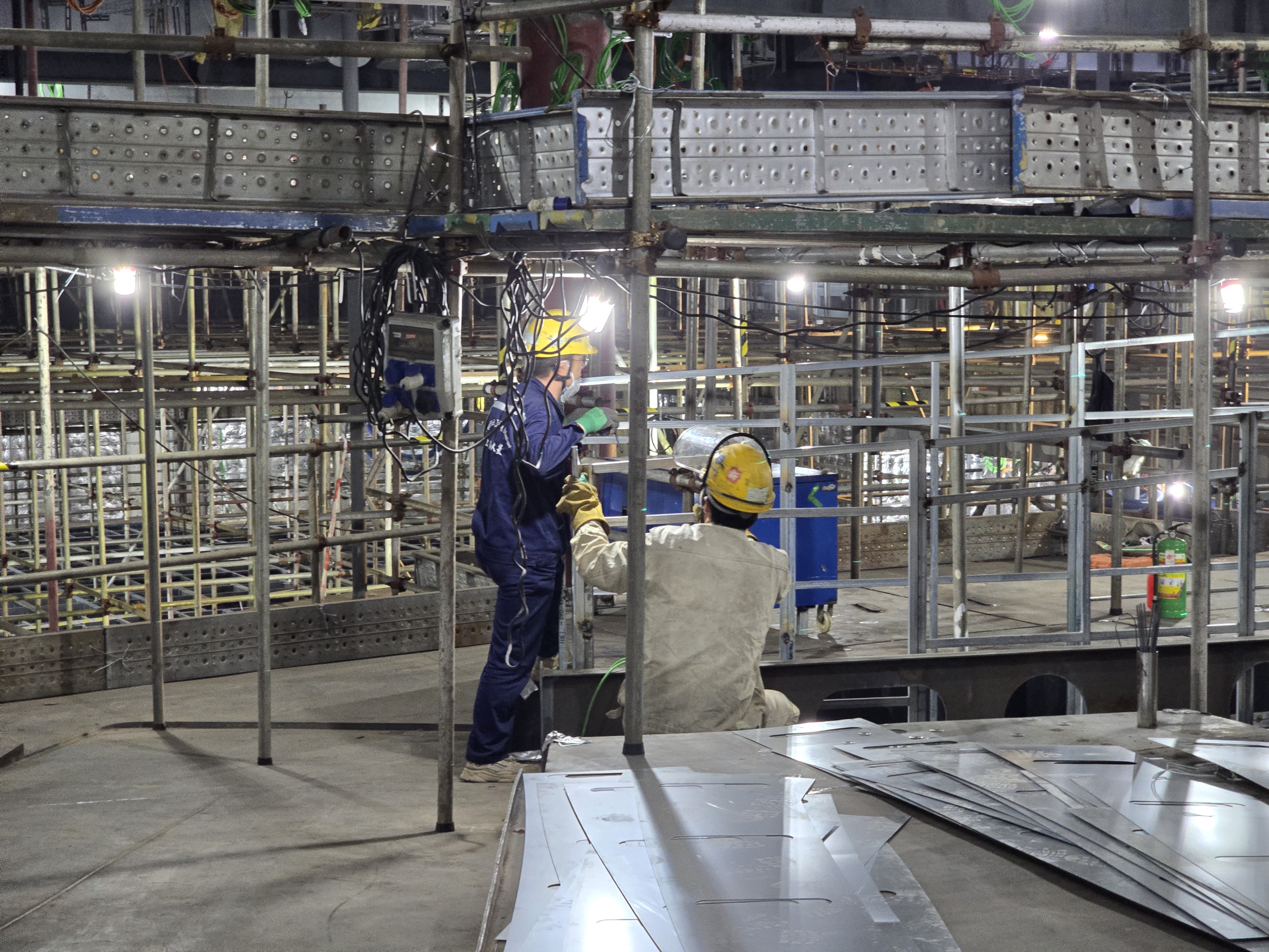起浮前,工人在船舱内进行施工。于玘珺摄影