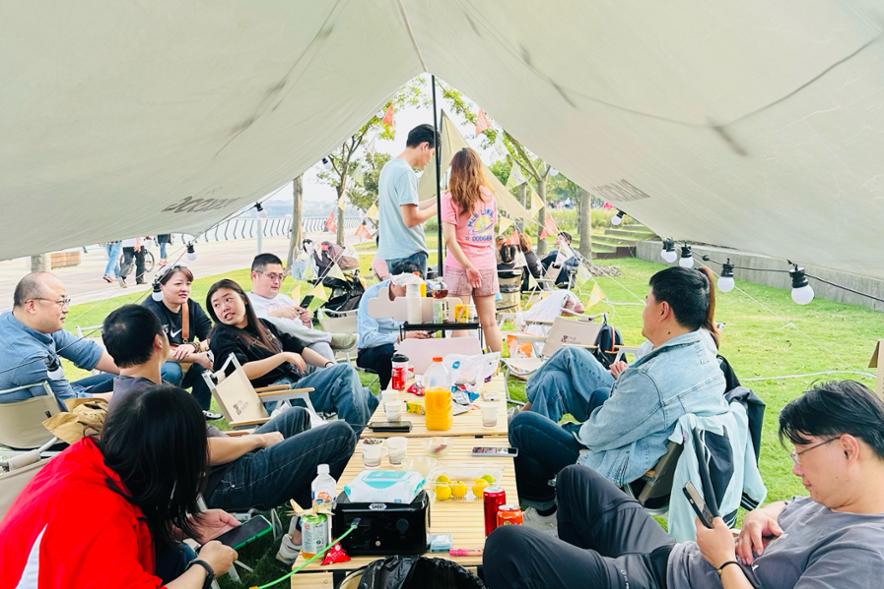家长们在户外喝咖啡聊天。受访对象供图
