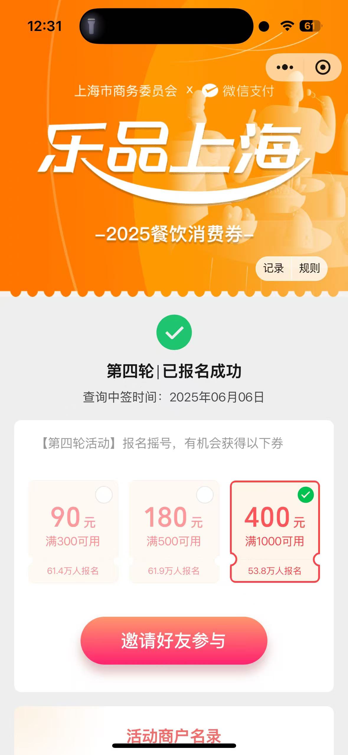 消费者晒图,参与“乐品上海”餐饮消费券报名摇号。受访对象供图