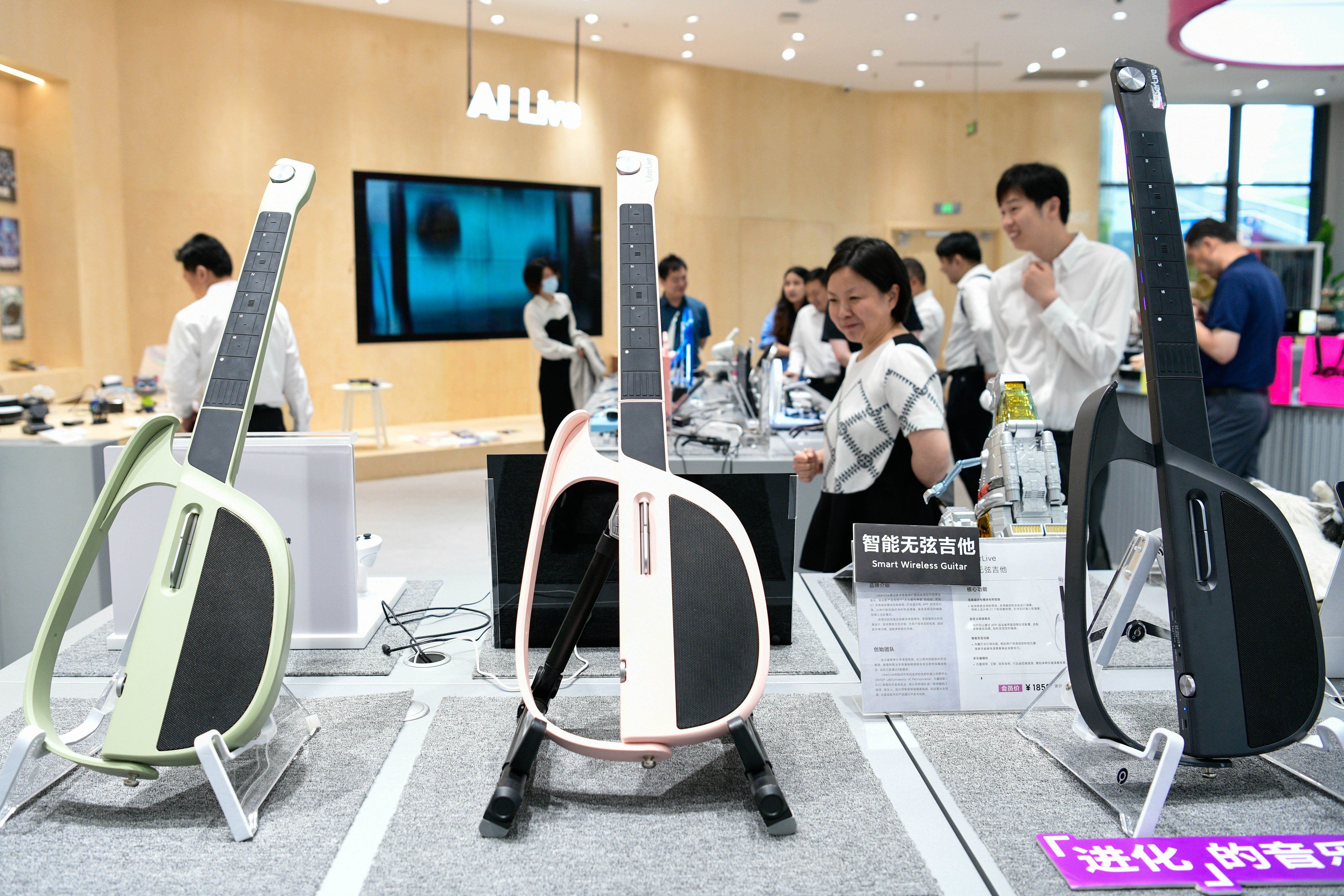 在“黑科技体验空间”,无弦的吉他也能奏出美妙的音乐。劳动报记者颜筱依 摄影