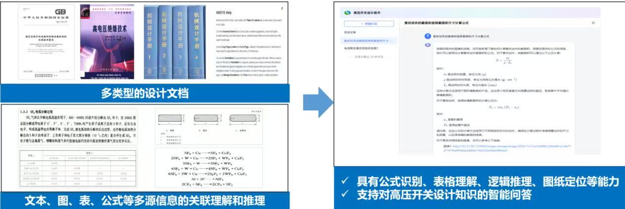 这背后是研究院开发的“AI+研发设计系统”。据介绍,系统中的智能辅助设计软件集成了输变电装备的国标、行标、企标等海量专业知识,基于行业私有知识增强与大模型工具调用技术,能够实现设计知识智能问答、公式识别、表格理解和逻辑推理。