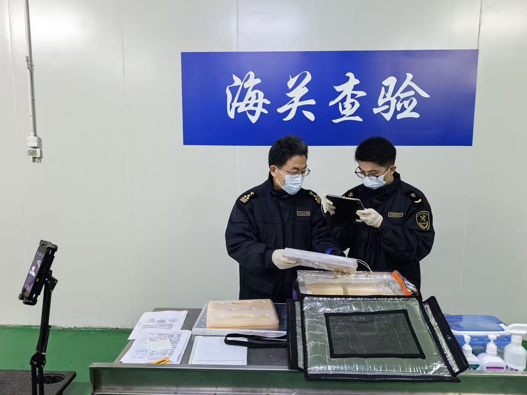 头图为上海科创中心海关关员对申报进口的CAR-T细胞治疗用原料实施快速查验放行。上海海关供图