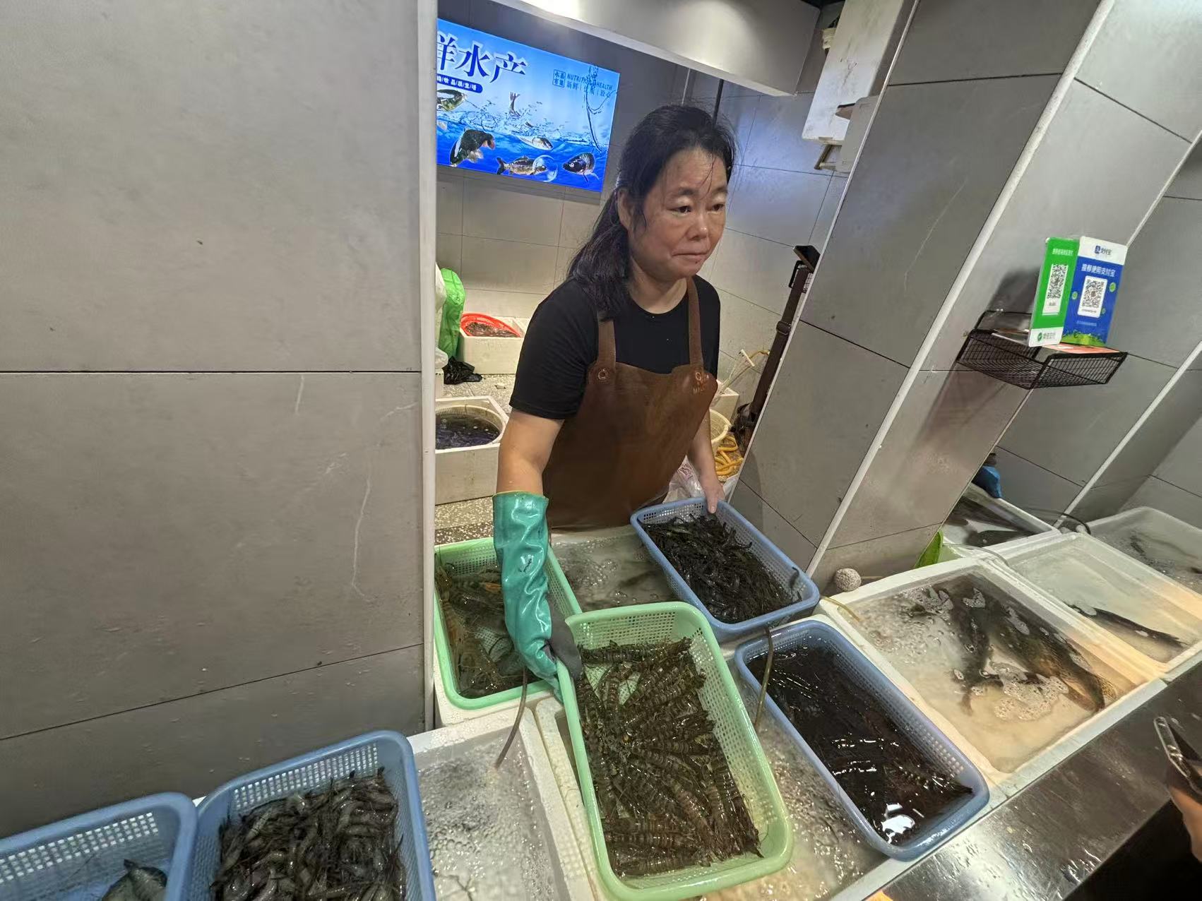 河虾、斑节虾等鲜活水产品旺销。劳动报记者陆燕婷 摄影