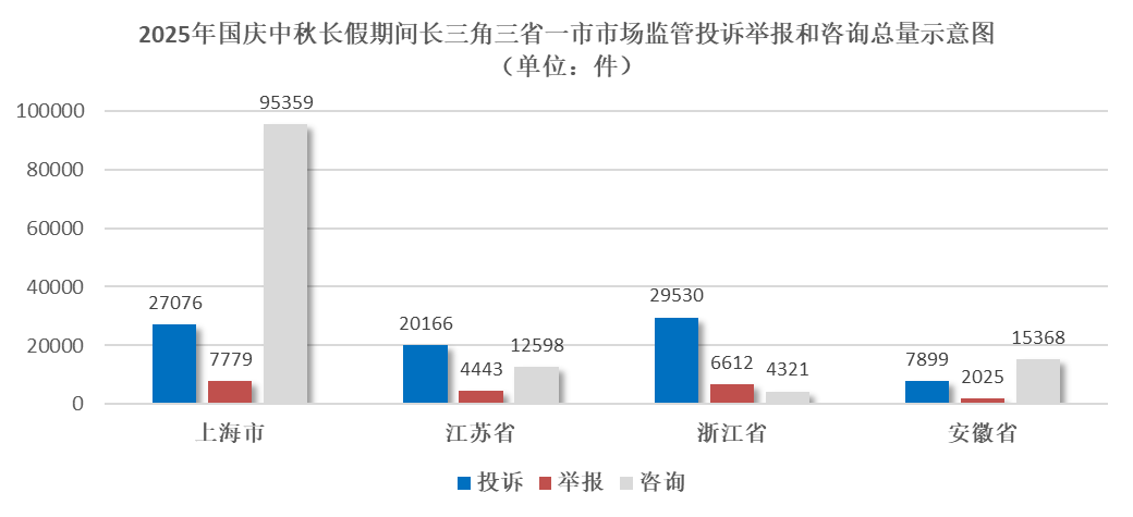 上海市市场监管局介绍,长假期间,三省一市市场监管投诉举报系统共受理投诉84671件、登记举报20859件、解答咨询127646件。其中,上海市受理投诉27076件、登记举报7779件、解答咨询95359件;江苏省受理投诉20166件、登记举报4443件、解答咨询12598件;浙江省受理投诉29530件、登记举报6612件、解答咨询4321件;安徽省受理投诉7899件、登记举报2025件、解答咨询15368件。