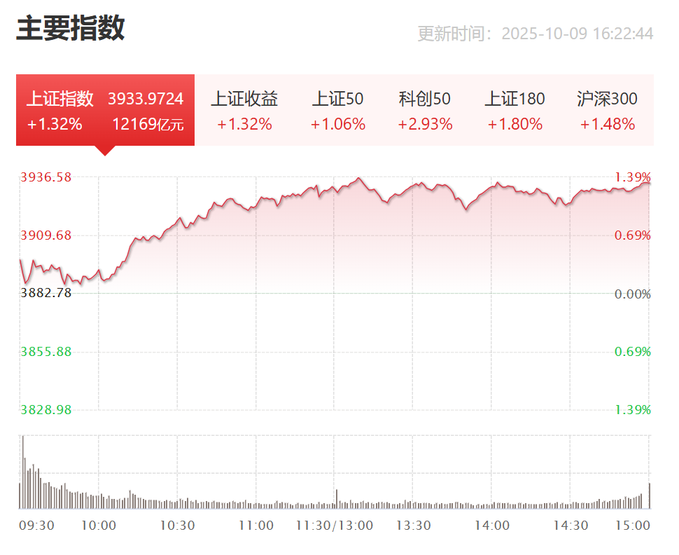 国庆、中秋双节后首个交易日,上证指数走强,时隔十年再次突破3900点。截至10月9日收盘,上证指数上涨51.19点,涨幅为1.32%,报收3933.97点,成交额12168.89亿元。