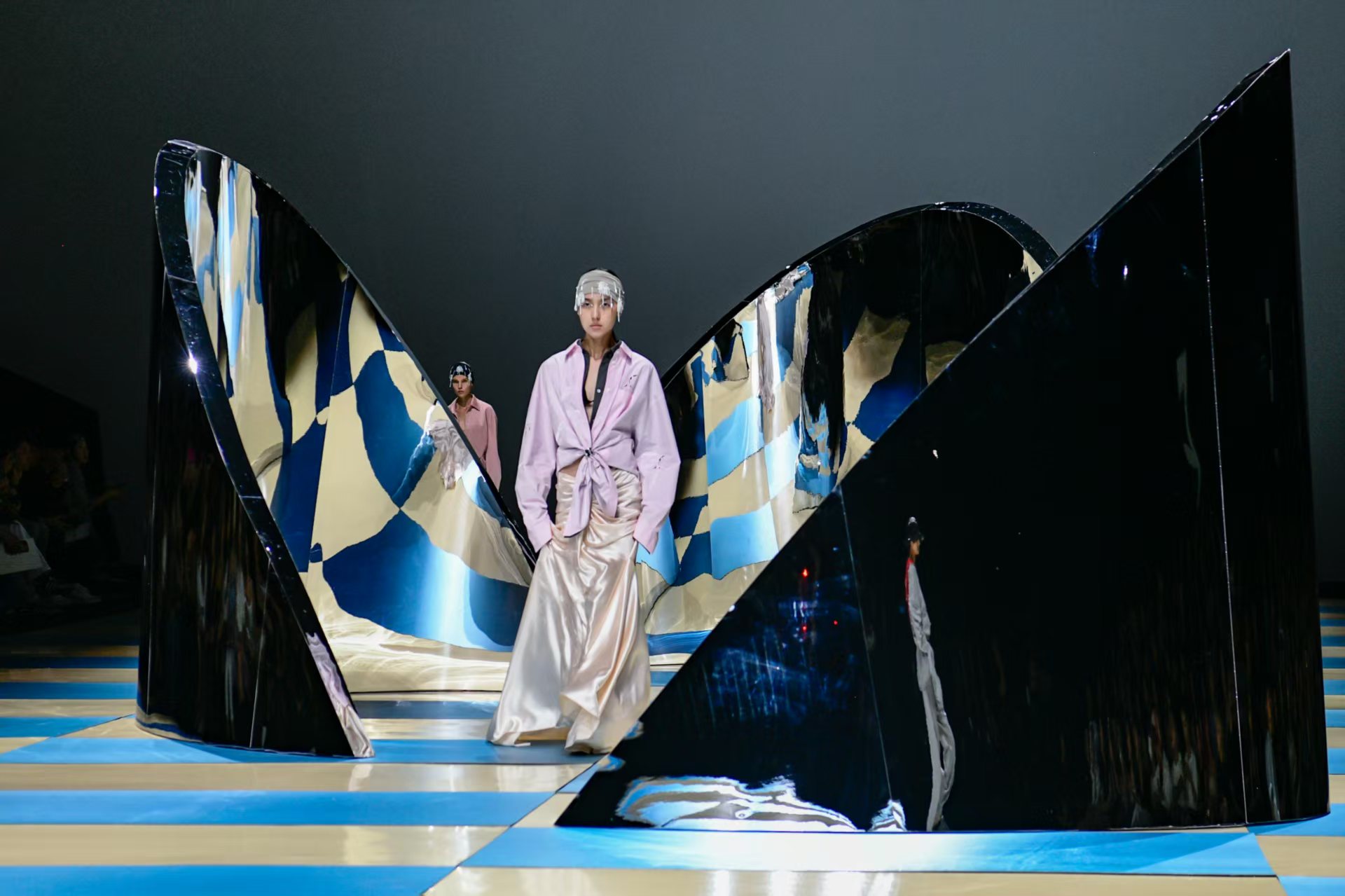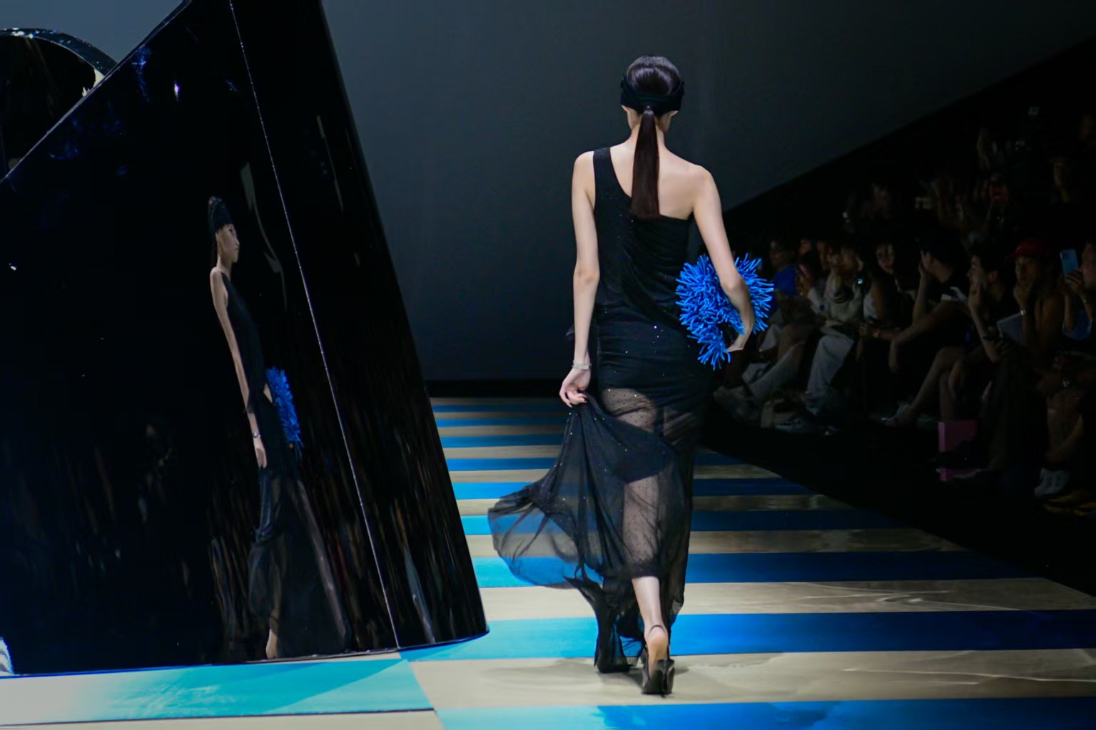 RuirUiruI本季借月相盈缺传递态度,以薄纱的柔韧呼应新月的可能性,用珠片的璀璨对应满月的丰盛,让解构的剪裁诉说残月的深邃。当模特行走于镜面之间,服装上的月相轨迹与地面倒影虚实交叠,仿佛在诉说:真正的风格从非定格于某一刻的完美,而是坦然拥抱每一次蜕变的过程——正如月相循环,藏在那永不停歇的变化之中。
