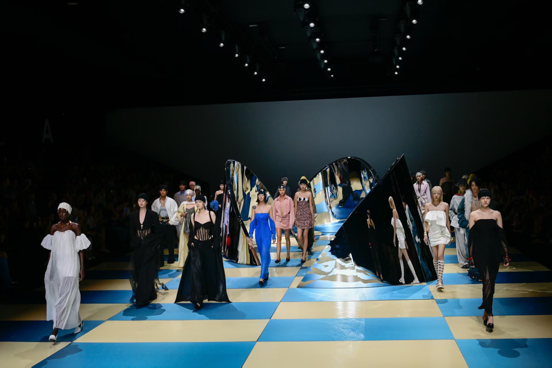 秀场中心特制金属弧形装置,以新月、满月、残月三相形态交错融合,高反射镜面材质通过凹凸变幻隐喻月相循环。棋盘格地面延伸出无限视觉,模糊真实与倒影的边界,强化了“轮回”与“无限”的概念。