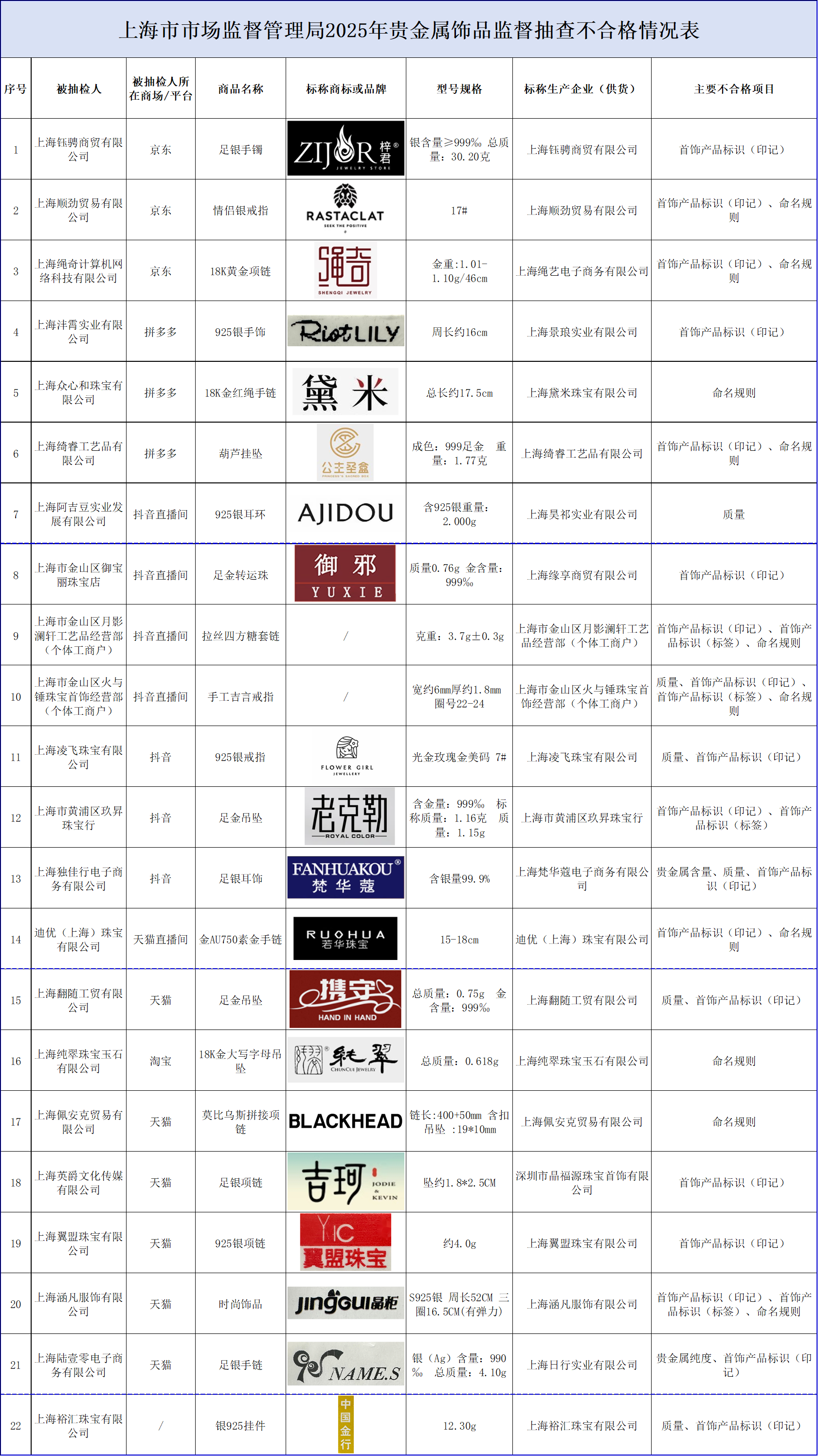 10月16日,上海市市场监管局介绍,针对消费者投诉、举报集中及质量问题较多的产品,近期,上海市市场监管局集中组织力量对宝山、嘉定、金山等5个区以及5家网络平台、2家直播间56家企业销售的51个品牌60批次贵金属饰品进行了监督抽查。经检测,有22批次不合格(其中直播间5批次),不合格检出率为36.7%,检测项目涉及贵金属含量、贵金属纯度、质量、首饰产品标识和命名规则。