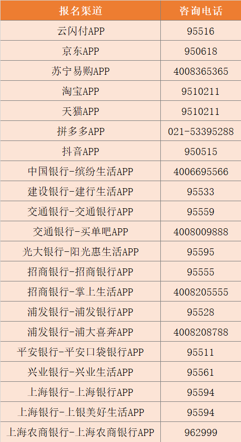 个人消费者可在规定时间内登陆云闪付、京东、苏宁易购、淘宝、天猫、拼多多、抖音、中国银行、建设银行、交通银行、光大银行、招商银行、浦发银行、平安银行、兴业银行、上海银行、上海农商银行等APP的报名渠道选择所需品类报名。消费者报名时需授权平台使用本人相关个人信息,包括姓名、手机号、地理位置等。如有任何问题,可拨打咨询电话。