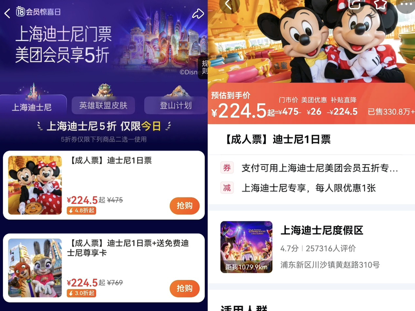 10月18日,美团“18会员惊喜日”正式开启。记者了解到,美团会员可在美团App以5折价格购买上海迪士尼1日标准成人票,同时,黑钻会员还可得上海迪士尼尊享卡,享受省上加省的双重VIP礼遇。该福利仅限10月18日当天。