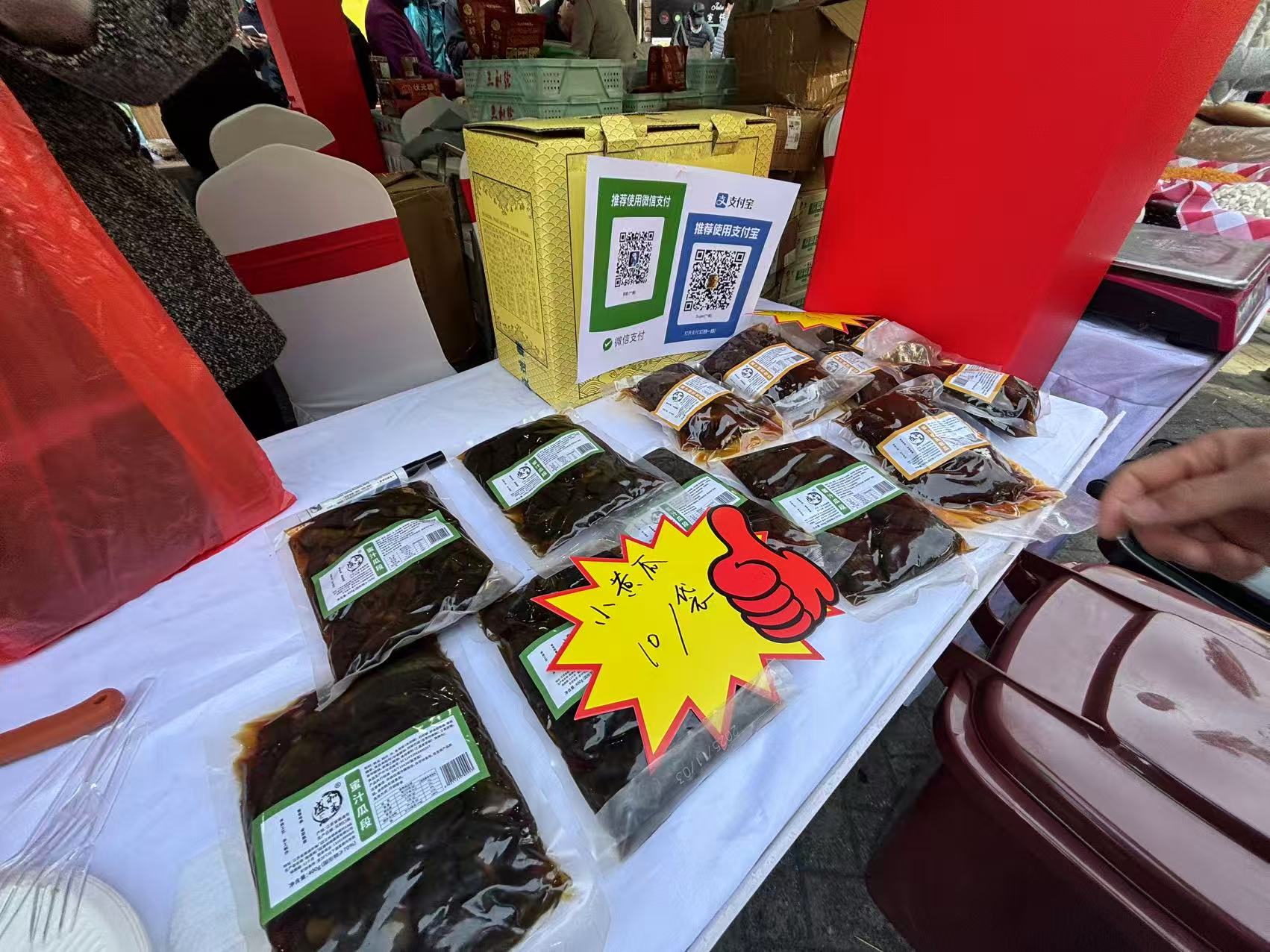 在现场,还能觅得淮海路上全国土特产商店的同款“蜜汁酱瓜”,还有闵行地产、来自上海农娱果蔬专业合作社的新鲜蔬菜,质优价廉。