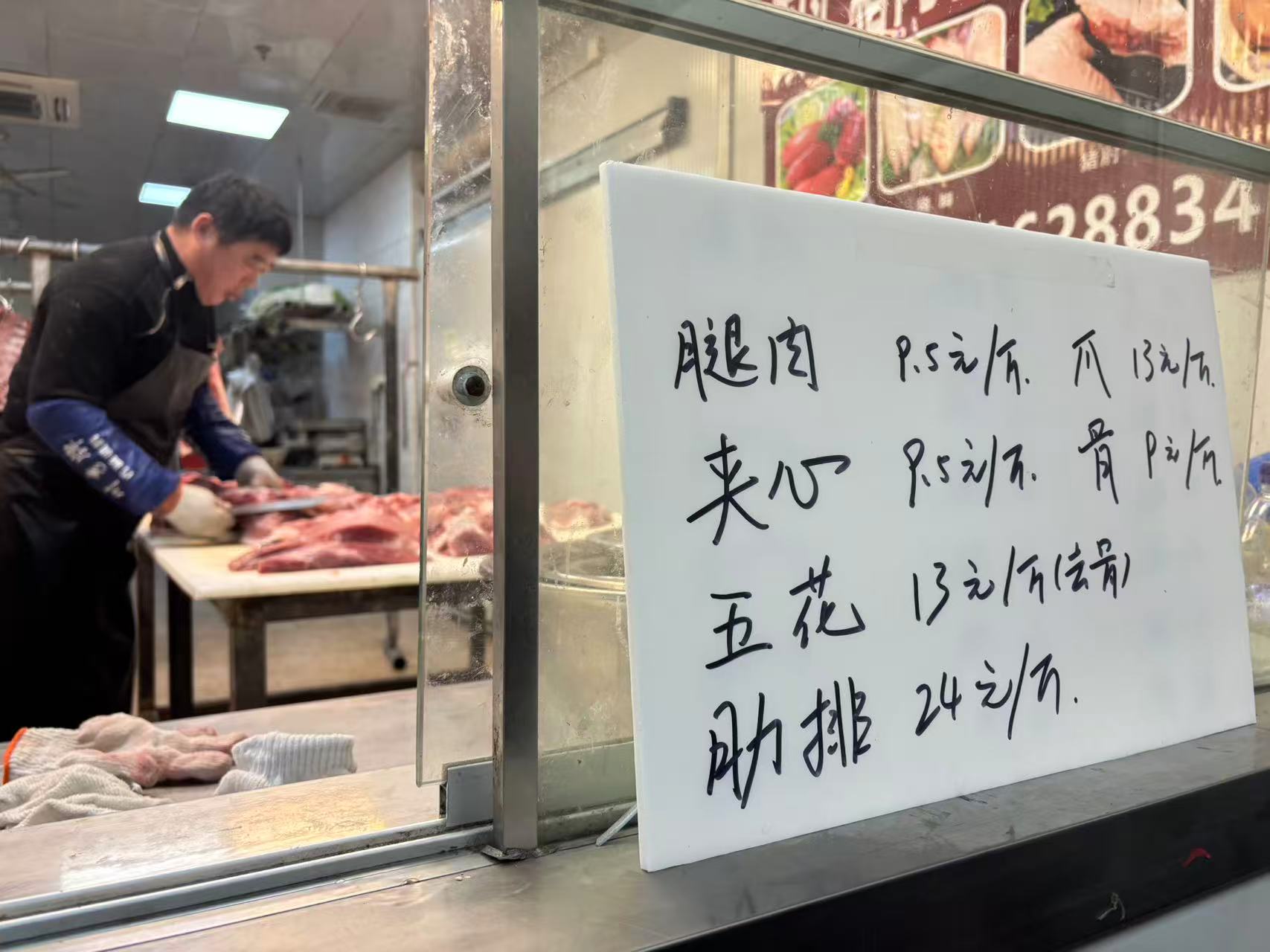 西郊国际一猪肉供应摊位正在分割猪肉(图为当日现场猪肉的零售价格)。劳动报记者陆燕婷 摄影