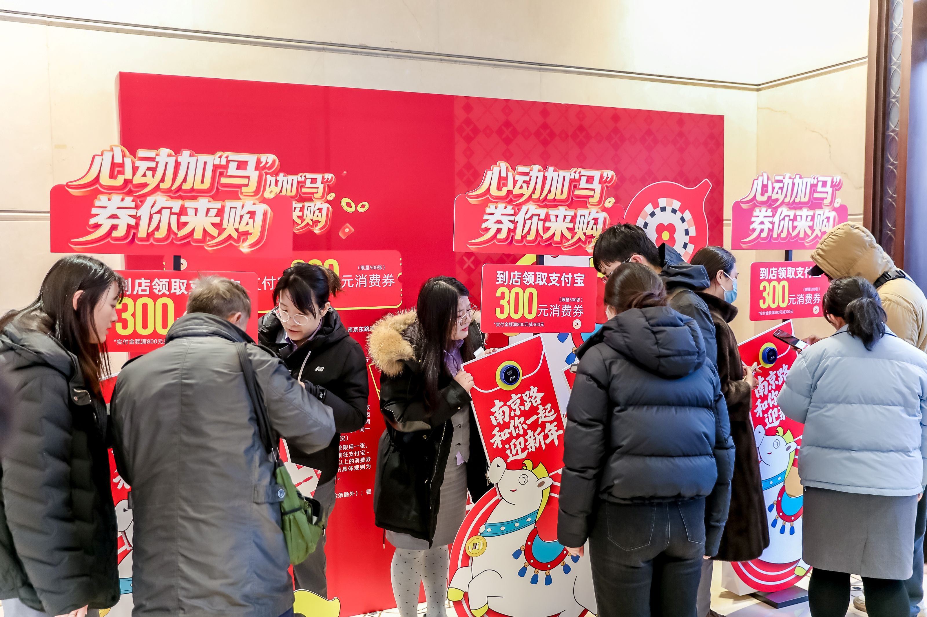 多重消费券叠加的实惠福利成为拉动消费的重要引擎,黄浦元旦消费券、“南京路和你一起迎新年”线上线下消费券与商场自有优惠叠加,让消费者尽享实在优惠。12月31日上午8点不到,商场门前已排起长队,市民争相参与“碰一下”活动领取支付宝“满800减300元”消费补贴券,500张限量名额迅速售罄,提前点燃跨年消费热情。