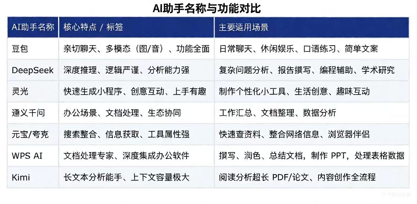AI助手选择众多,看似复杂,但如果按核心特长来分,它们大致可以分为几个类型:有的像知识渊博的学者,有的像创意十足的助理,还有的像手脚麻利的管家。了解其特点,才能精准选择。