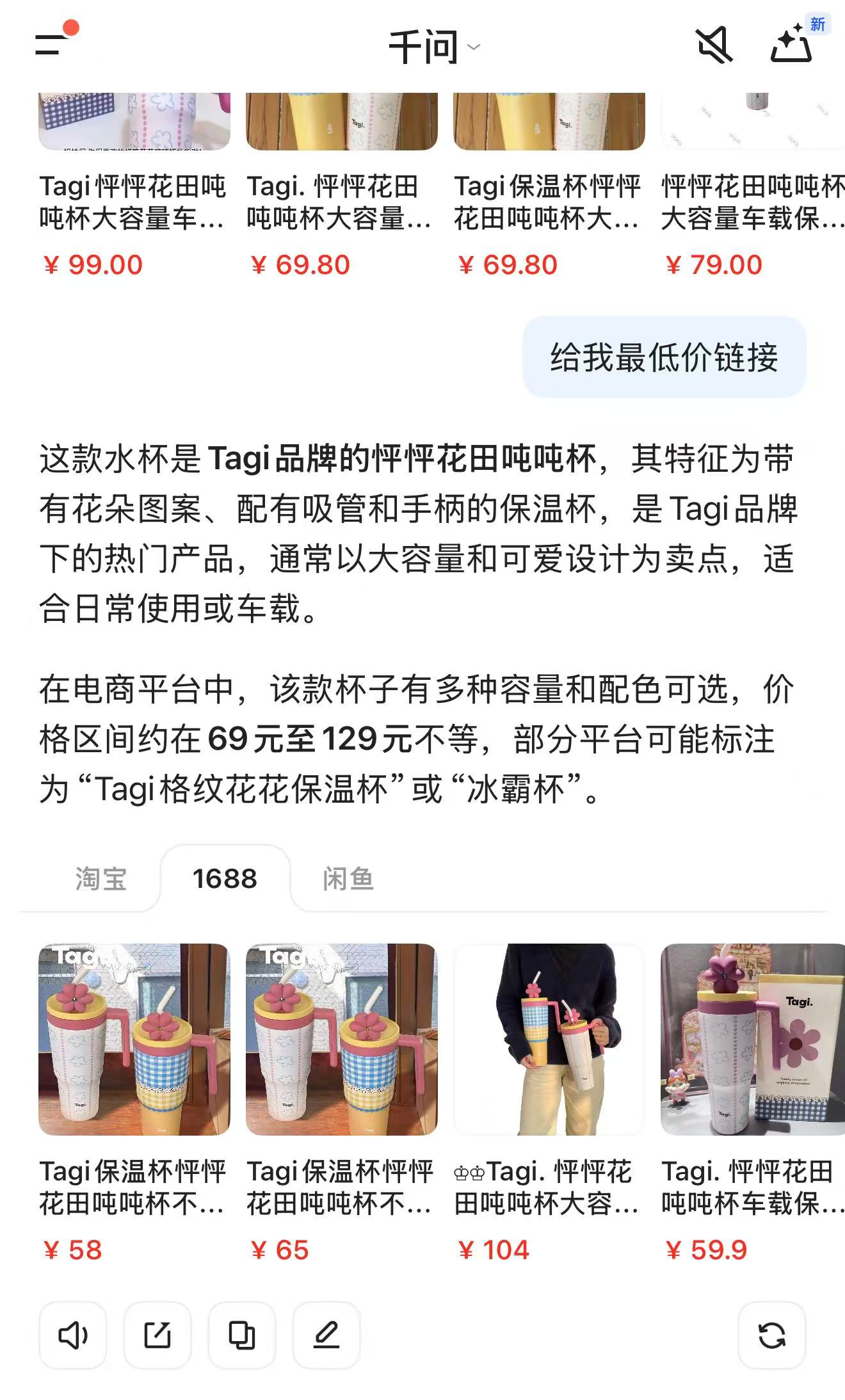 如果你想让AI直接帮你比较不同平台的价格甚至推送链接,那么通义千问目前具备这一可能性。笔者实测随手拍了一款保温杯,镜头一扫,它瞬间就认出了商品。更实用的是,屏幕上直接列出了从淘宝、1688、闲鱼等平台找到的同款链接,并已按价格从低到高排好序。点击链接,应用直接跳转到了商品页面,从拍照到完成比价、进入购买界面,整个过程一气呵成。