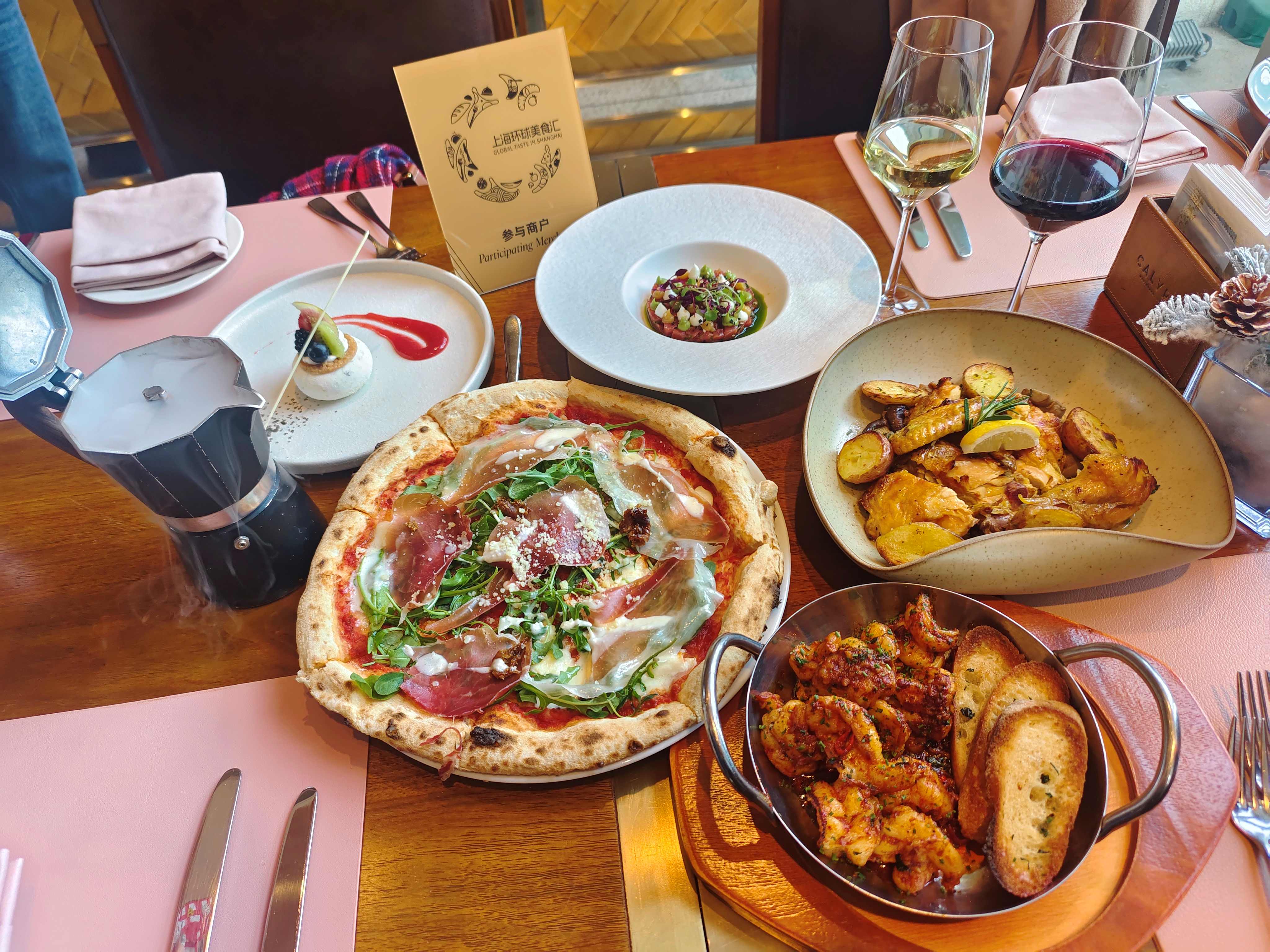 工作日的午餐时分,在静安嘉里中心南区广场Calypso地中海餐厅·酒廊,一楼几乎满座。金枪鱼塔塔、蒜味大虾为前菜,香烤三文鱼、香烤蘑菇鸡、地中海火腿披萨可三选二,餐厅特色的牛轧糖慕斯、地中海提拉米苏,再搭配饮品的套餐以5.4折的低价呈现在顾客面前。从2026年“上海环球美食汇”启幕以来,其客流整体增幅达20%至30%。而近期,来自欧洲、马来西亚和新加坡等地的游客数量明显上升。