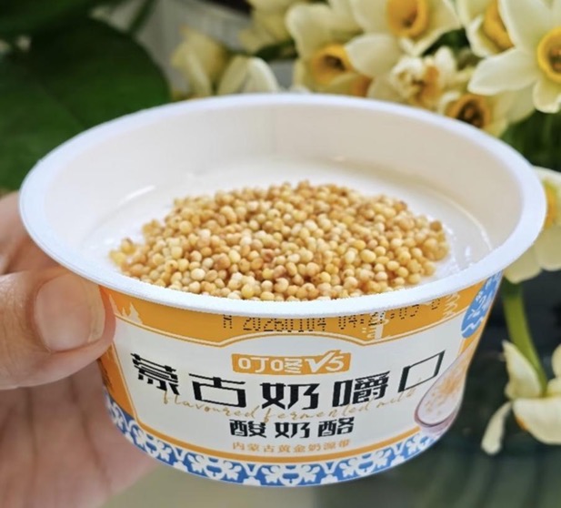 蒙古酸奶酪俗称“奶嚼口”,是内蒙古一种极具特色的传统乳制品,由酸奶自然发酵后上层凝结而成,口感醇厚微酸,奶香浓郁。在当地,它常作为“酸奶油”使用。内蒙人的早餐会用奶嚼口搭配炒米、白砂糖作为早餐食用。“叮咚V5蒙古奶嚼口酸奶酪”走红并非偶然,从去年火爆全网的干噎酸奶、奶皮子酸奶,到如今的奶嚼口,低温酸奶现在正呈现“越来越干”的新品趋势。