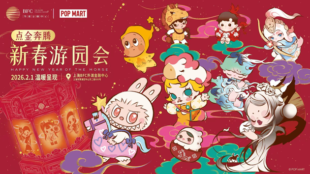 2月1日起,泡泡玛特潮流新年将空降外滩。步入BFC北区广场,一座别出心裁的宫灯旋转木马装置瞬间点亮新春夜空,新春游园会于此开启:传统宫灯的朱红飞檐下,暖黄灯箱勾勒出12个泡泡玛特经典IP形象,宛如将童话藏入中式画框;下层木马在光影中交织出马年的奔腾意象与喜庆的年节氛围;宫灯一侧,LABUBU的萌趣灯组与旋转木马相映成趣。