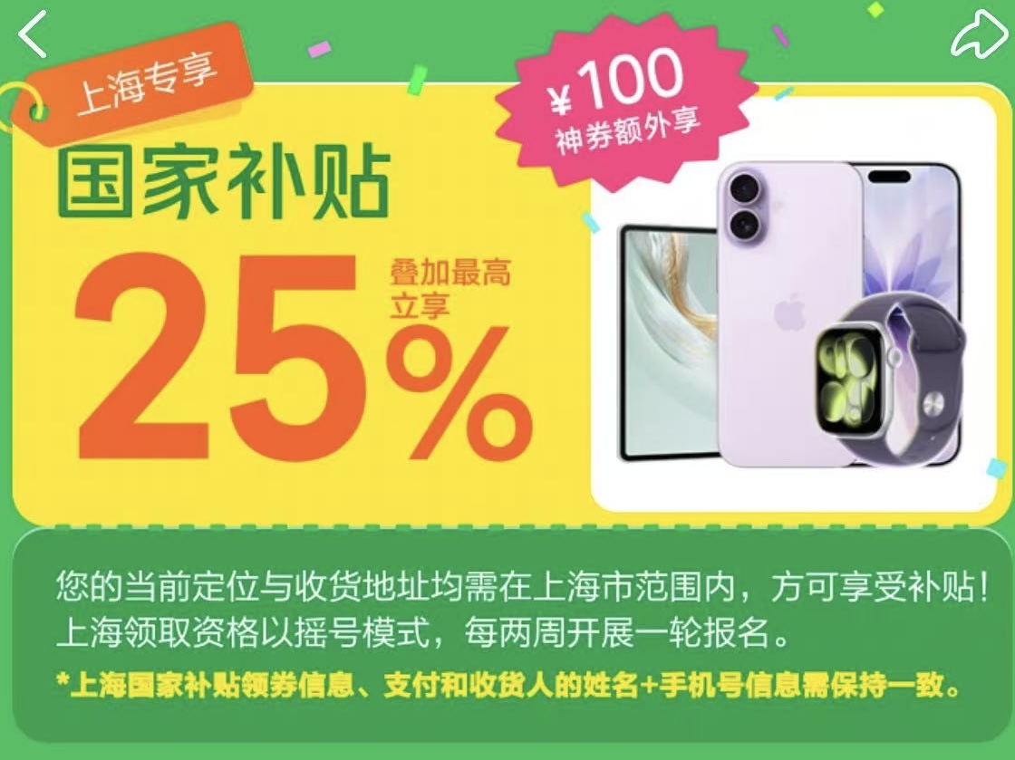 记者了解到,购物平台美团闪购联合华为、苹果、小米等品牌门店上线上海国补。上海市民在美团App搜索“国家补贴”,即可进入相关页面,按规则领用15%的国补优惠,从附近品牌门店选购手机、平板和智能穿戴设备,下单后即时送达。此外,平台还推出了数码年货补贴,可与国补叠加使用,部分商品优惠幅度最高可达25%。