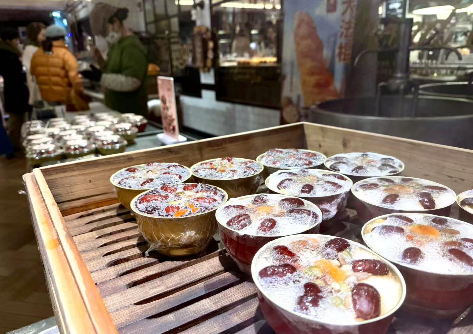 除了丰盛的年夜饭礼盒,南京路上的“年味细节”更让人念念不忘。软糯香甜的八宝饭,是上海人年夜饭桌上不可或缺的压轴甜点。春节前夕,“上海糕团大王”沈大成的后厨正全力加码制作,每一口都软糯回甘,藏着童年记忆里的年味。第一食品商店的零食糖果、泰康食品的经典熟食,也都是市民采购年货的热门之选,一站式承包新春“嘴瘾”。