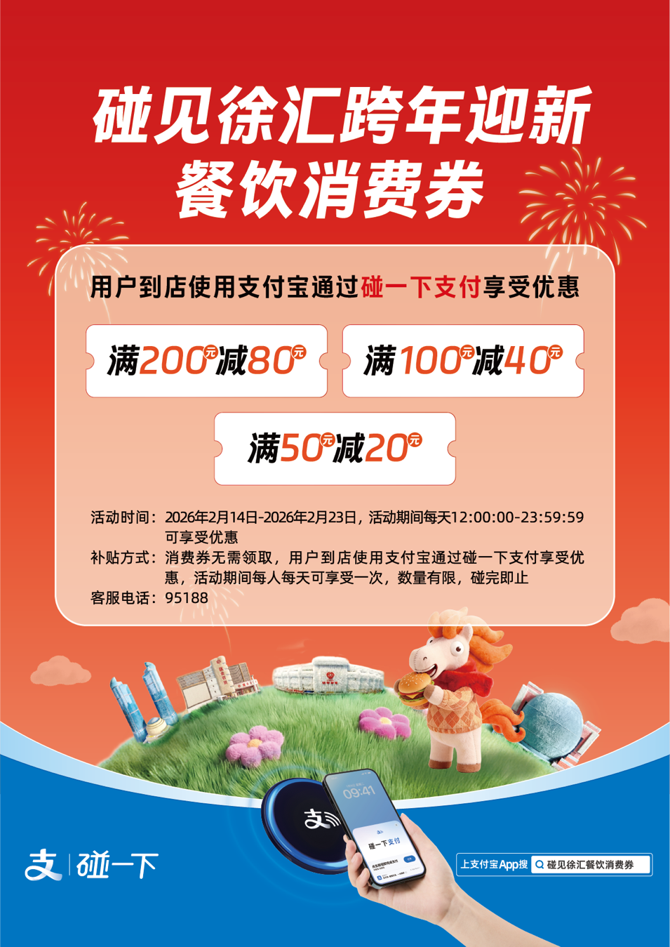 本次“碰见徐汇”活动采用线下“碰一下”模式,无需提前领券、无需蹲点抢券。2月14日至2月23日每日12:00-23:59(具体核销时间以商户营业时间为准),市民前往徐汇区指定餐饮商户,消费时拿出手机轻触收银台支付宝“碰一下”设备,系统将根据实际支付金额自动匹配三档优惠:满50元减20元、满100元减40元、满200元减80元。活动期间每人每天限享1次,数量有限先到先得。