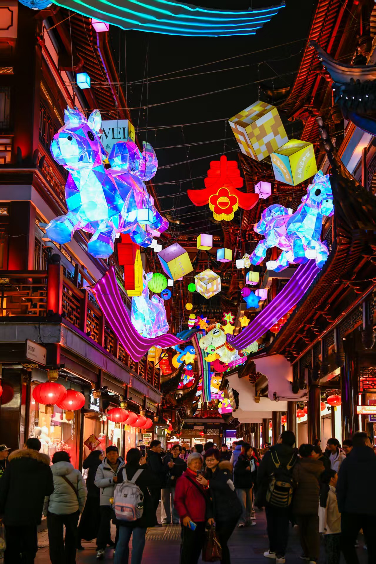 再向前行,便是曾以“一夜鱼龙舞”灯组而闻名的凝晖路,本届豫园灯会,凝晖路“舞马踏福”灯组更显意趣盎然。在飞檐翘角之上,“历史人文段”溯源古韵的六匹舞马、“未来科技段”由像素方块构成的科技舞马、以及“现代潮流段”化身各色角色的舞马精灵”等三段主题各异的舞马凌空奔驰。