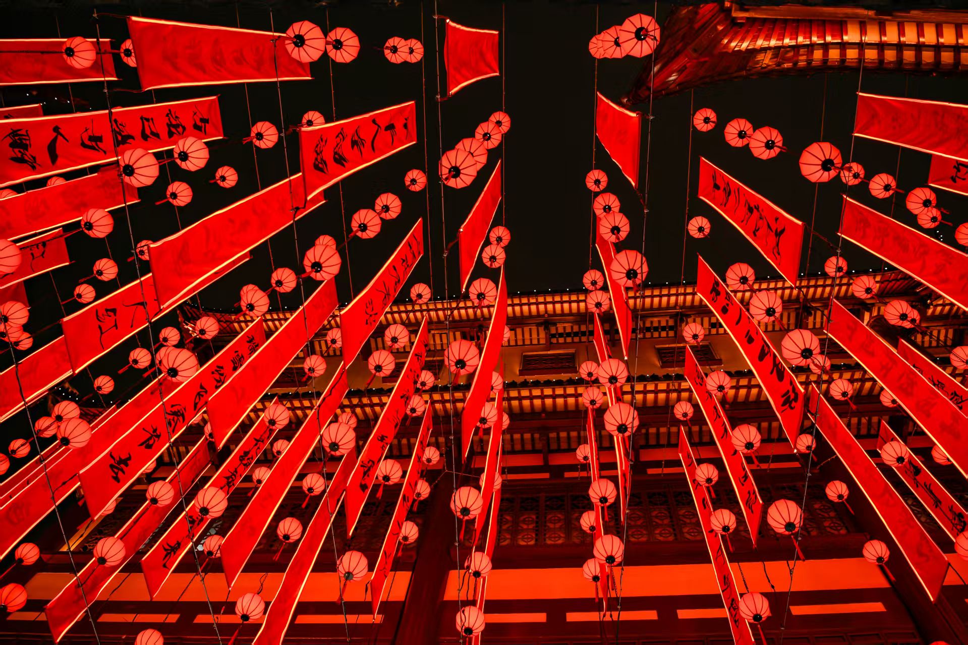 在巨型走马灯旁,抬头看去,是连绵成阵的巨幅楹联,中国红的楹联上题上金色的新春福语,呈现出“葫光流转,万象呈祥”的新春景象。
