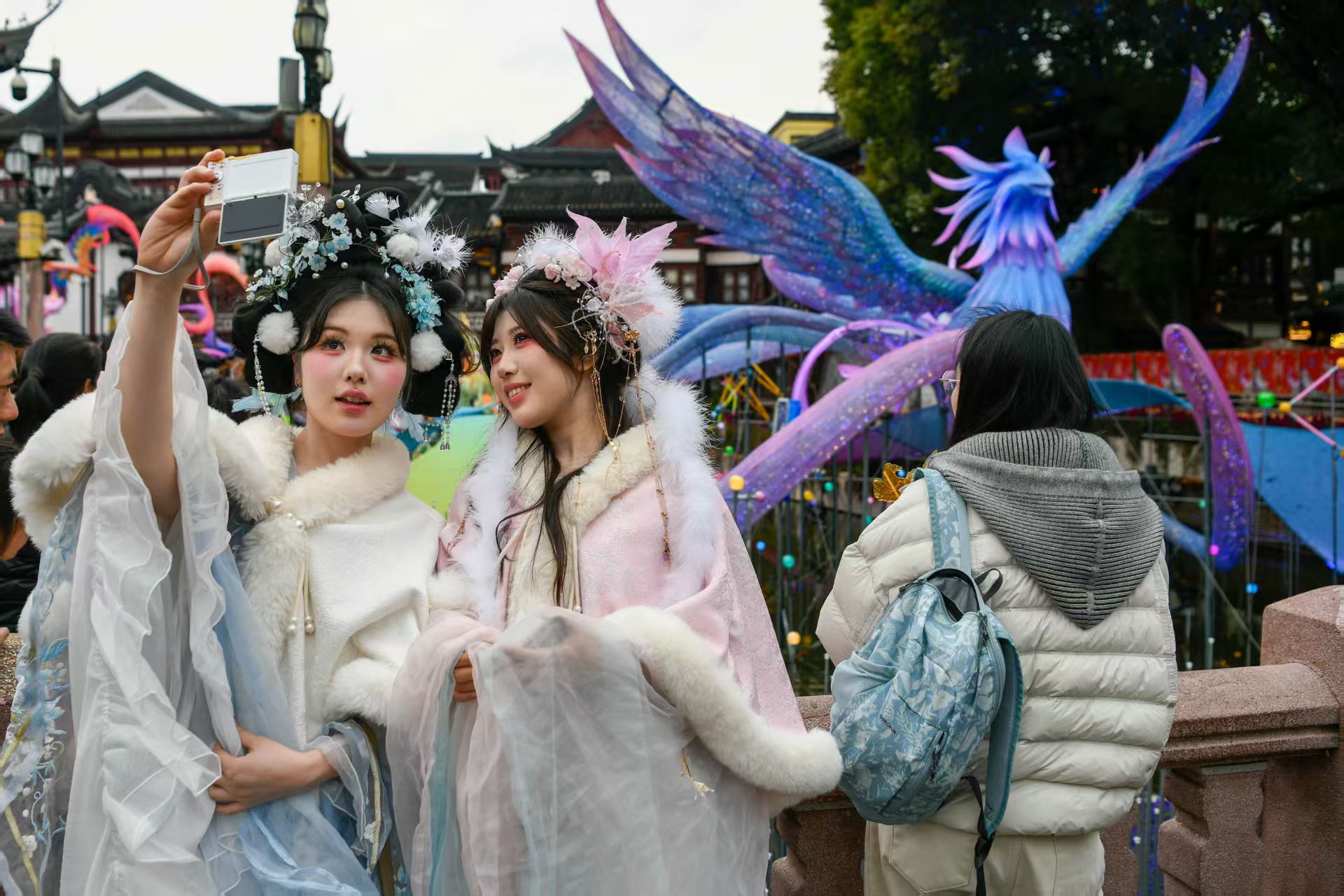市民游客身着汉服在九曲桥上拍照打卡。劳动报记者颜筱依 摄影