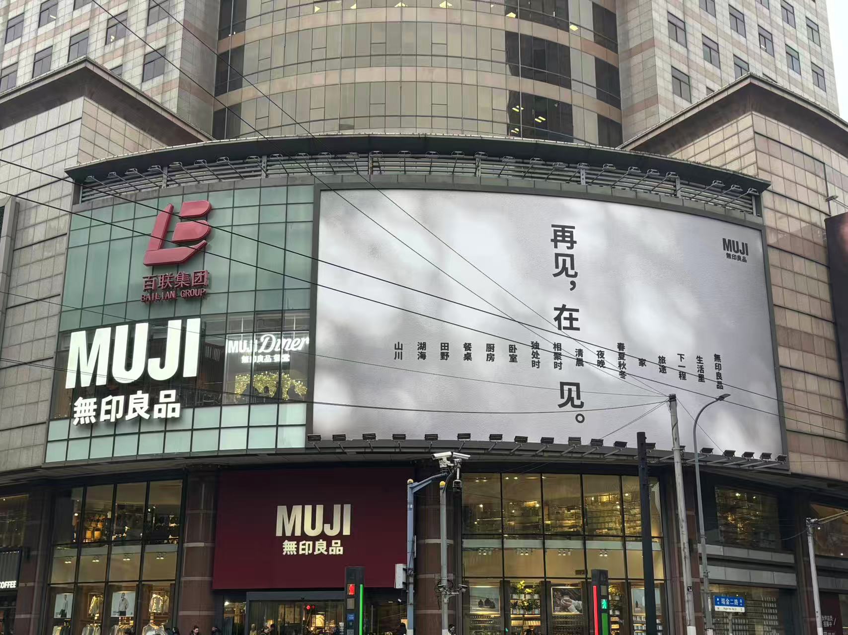 淮海中路瑞金二路路口,MUJI無印良品上海淮海755世界旗舰店挂出偌大的“再见”谢幕字幅,引来广泛关注。劳动报记者在现场看到,闭店前,该店开启的“闭店特惠活动”吸引大客流前来选购。据悉,品牌将于下月在上海徐家汇开出一家新的双层旗舰店。