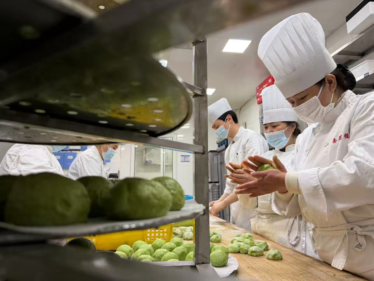 “现制现售的青团共有5种,网红、也是杏花楼首创的‘咸蛋黄肉松青团’仍是市民最为喜欢的品种。荠菜肉、马兰头、豆沙青团,则是多年来热销的品种。今年的创意新品,就属‘春三鲜’了,把‘春天’包进青团里,让‘咬春’成为新时尚。”杏花楼餐饮部副经理汪夏萍告诉劳动报记者,今年,包括现制现售、预包装、以及部分商超款在内,杏花楼共出品二十多款青团,是青团品类最多、销售渠道最广的一年。