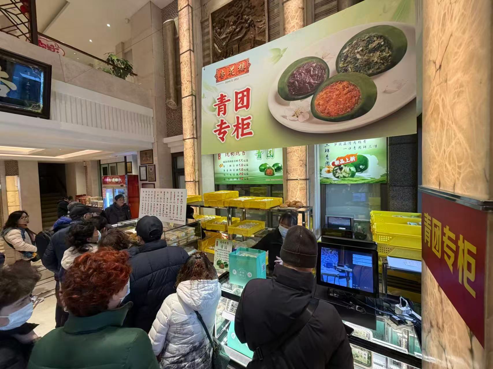 福州路上老字号杏花楼的现制现售青团已开售。今年,适逢杏花楼总店一楼食品旗舰店正在焕新升级改造中,青团销售移至旁边的一楼餐厅大堂。现场,有不少消费者正在选购时令青团商品。