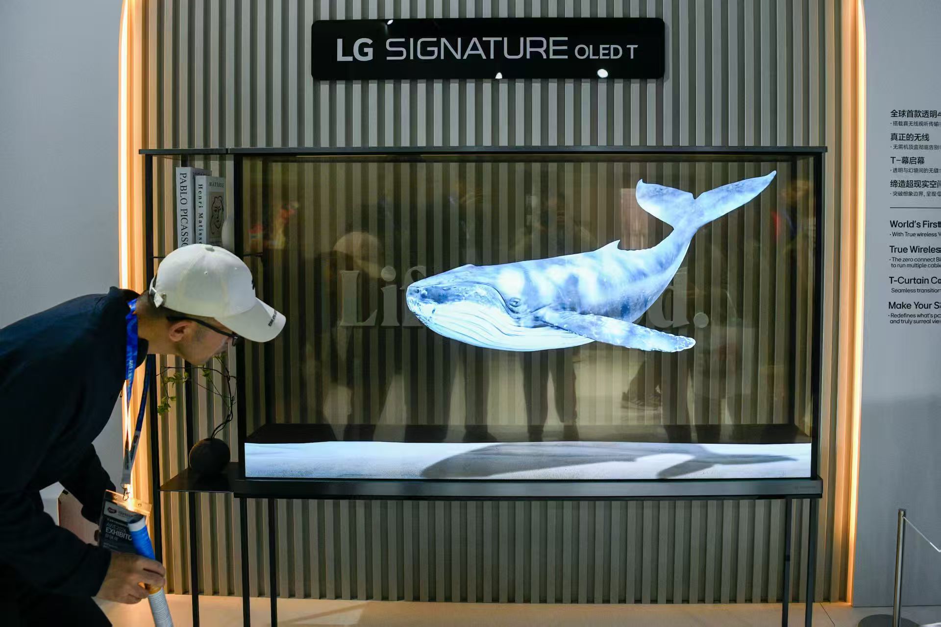 LG AI展区则尽显高端AI电视的魅力。全球首款77英寸透明OLED电视LG SIGNATURE OLED T首次亮相,核心“T-幕落”技术让屏幕在透明与4K显示状态间无缝切换,透明时与背景融为一体,显示画面时色彩鲜活、细节拉满;首展的LG OLED evo W6电视则以9.9毫米超薄机身搭配Zero Connect Box无线传输组件,实现4毫秒内低延迟传输,彻底摆脱线缆束缚,硬核的技术实力收获现象观众驻足拍摄。